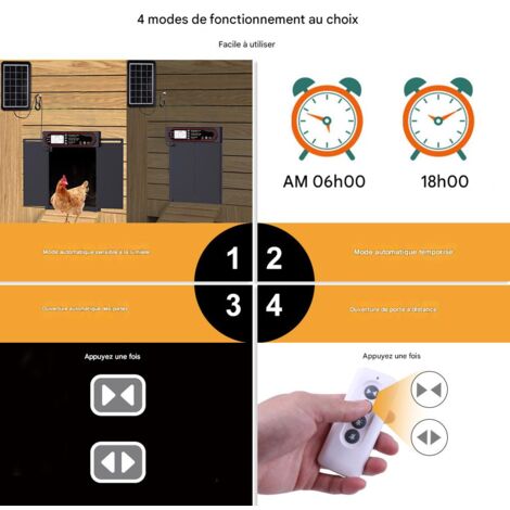 Porte Poulailler Automatique Solaire Avec Affichage LED, Porte De Poulailler Electrique En Aluminium Avec Minuterie Et Telecommande Porte De Poulailler Etanche Et Anti Pincement Ipx45 87983440 Trappe Poulailler Automatique Porte Poulailler Automatique Solaire avec Affichage LED, CHAMUTY Porte Automatique Poulailler en Aluminium avec Capteur de Lumière, Minuterie, Télécommande, Deux Méthodes de Chargement, Anti-pincement EN STOCK : Porte Automatique Poulailler, Batterie avec Écran LCD Programmable Étanche, Porte Automatique Poulailler en Aluminium avec Minuterie, Porte Poulailler Automatique, Ouvre-Porte Vertical, MNLX2601030982 pas cher. Livraison rapide partout en France Description du produit Porte de poulailler automatique à énergie solaire - Écran LCD - Avec minuterie et capteur de lumière - En alliage d'aluminium - Avec télécommande et 4 modes automatiques Mode d'emploi No Acheter Ouvre-porte automatique de poulailler en aluminium, 4 Modes, avec télécommande/minuterie/lumière