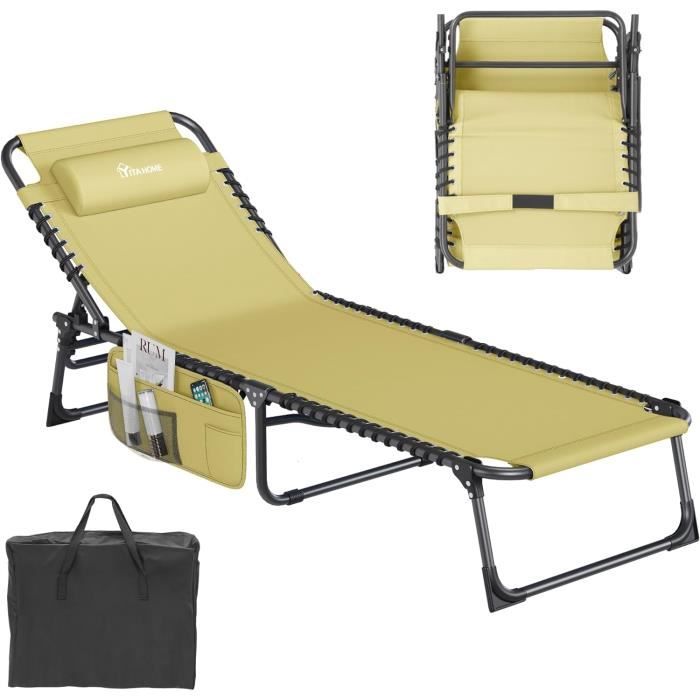 Lot De 2 Chaise De Jardin Pliable 5 Positions Réglable, Bain De Soleil Pliants, Lit De Camping Transat Piscine Pliable Chaise Longue Grise Réglable Extérieur 6 Positions Transat De Jardin - Ciel & Terre Commerce Appui-tête Détachable Ne manquez pas cette occasion d'améliorer votre vie en plein air! ROBUSTE ET STABLE- Taille complètement inclinée : 190L x 60W x 31Hcm. ACCESSOIRES COMPLETS- Un appui-tête détachable vous permet d'ajuster librement le soutien du cou, une poche latérale offre un endroit pratique pour ranger des livres, des magazines ou de petits objets. YITAHOME Bains de Soleil 190x60x31 cm Chaise Longue Réglable en 4 Positions, Transat Jardin Exterieur avec Appui-tête et Poche Latérale Capacité Il est également doté d'un sac de transport portable, d'une dragonne et d'une bandoulière, ce qui vous permet de l'emmener facilement lors de vos activités de plein air et de profiter de votre temps libre. Découvrez notre évaluation détaillée des bains de soleil YITAHOME : confort, réglabilité et qualité sont au rendez-vous pour des moments de détente inégalés APPLICATIONS MULTIPLES- Cette chaise longue YITAHOME est conçue pour s'adapter à plusieurs applications et améliorer votre temps de loisirs. LÉGER ET PORTABLE- Notre chaise longue pliante est conçue avec légèreté et portabilité à l'esprit.