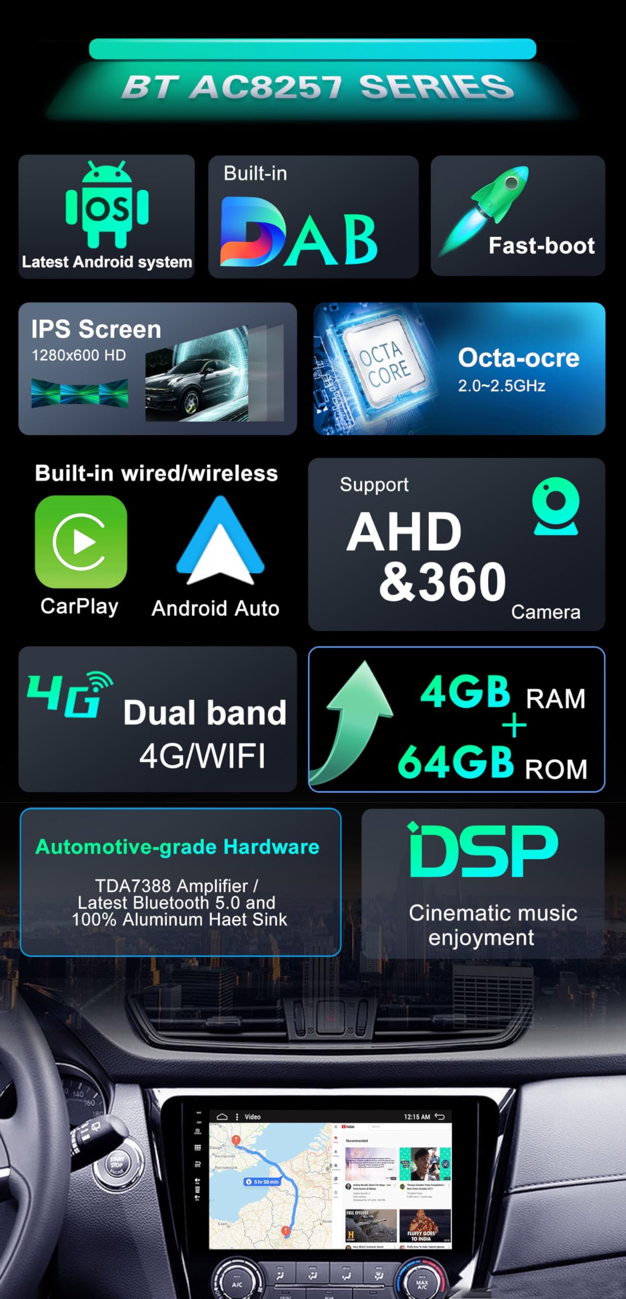 Compatible : la plupart des scanners OBD2 et wifi OBD2 Radio : Radio de marque : tuner AM/FM intégré (dans le monde entier), radio RDS Tuner AM/FM - Gamme de fréquence : 522 - 1620 KHz, 87,5-108 MHz COMPATIBILITÉ DU VÉHICULE] Convient pour Nissan XTrail Qashqai j11 Rouge (2014-2018).Veuillez vérifier les dimensions du produit avant d'acheter, si vous n'êtes pas sûr, veuillez nous fournir la photo du tableau de bord Informations système Système d'exploitation Android 15 TOP-CPU : Rockchip AC8257 A53 - Octa Core. 【FAST BOOT - CAMERA 360°】①Accéder au système en moins de 2 secondes, pour accélérer le temps de démarrage du système Android de 25s à seulement 2s n'est jamais facile. 【COMPATIBILITÉ DU VÉHICULE】 Convient pour Nissan XTrail Qashqai j11 Rouge (2014-2018). Puissance de sortie : Max 4x50W - Radio IC-TDA7786 - Amplificateur IC-TDA7388., Matériel de qualité automobile, dissipateur de chaleur 100% aluminium. ② Inclure: LED Caméra arrière | Microphone externe. SXAUTO - 6G+128G - Android 12 IPS Autoradio für Opel Vauxhall Astra J Fonction de lien miroir Prise en charge de la mise en miroir des téléphones Android et Iphoen Avec Mirrorlink, vos téléphones Apple et Android sont pris en charge de manière optimale avec la musique, la vidéo et le streaming d'écran, la synchronisation du répertoire téléphonique, le Bluetooth, le contrôle de l'écran (Android) et les appels. 【LARGE GAMME DE FONCTIONS】Navigation GPS en ligne et hors ligne - Meilleure réception radio WiFi - 4G - FM RDS - OBD2 - Commande au volant - Prise en charge de la lecture 4K (3840 × 2160 pixels) - Réglage EQ - Prise en charge DAB + (Adaptateur : B092D31BVX) - USB ou MicroSD (jusqu'à 500 Go) - AHD Caméra - IPS Écran. SXAUTO U300eBuilt-in 4G / Dabu300fAndroid 14-6G+128G Autoradio Pour Nissan X-Trail Qashqai J11 Rouge (2014-2018) - Sans Fil Carplay/Android Auto/DSP Camu00e9ra + MIC - 10.1 Pouce 2 Din Volant 360-CAM AHD HDMI 【ANDROID 15 , 6G + 128G , 8-CORE 】① Android 15, - 6GB RAM + 128GB ROM - , CPU - Rockchip AC8257 A53 - Octa Core - Processeur 64 bits - 2,0 GHz. Radio numérique DAB + (prise en charge, boîtier DAB + requis,Asin : B092D31BVX) Prend en charge le module DAB+ entièrement fonctionnel pour la réception radio numérique - branchez simplement l'antenne DAB+ et DAB et vous avez terminé ! Radio DAB une expérience particulière dans le véhicule. Entrée caméra (Caméra de recul LED Inclure) Prend en charge la caméra de recul Il passera automatiquement à la caméra de recul lorsque la marche arrière est engagée. OBD2 (pris en charge), Avec une application appropriée (par exemple Torque, disponible dans le Play Store) et un module Bluetooth OBD2, vous pouvez récupérer la mémoire d'erreur du véhicule et avoir des informations supplémentaires et des valeurs importantes affichées en temps réel sur l'écran sous forme de tableau de bord.