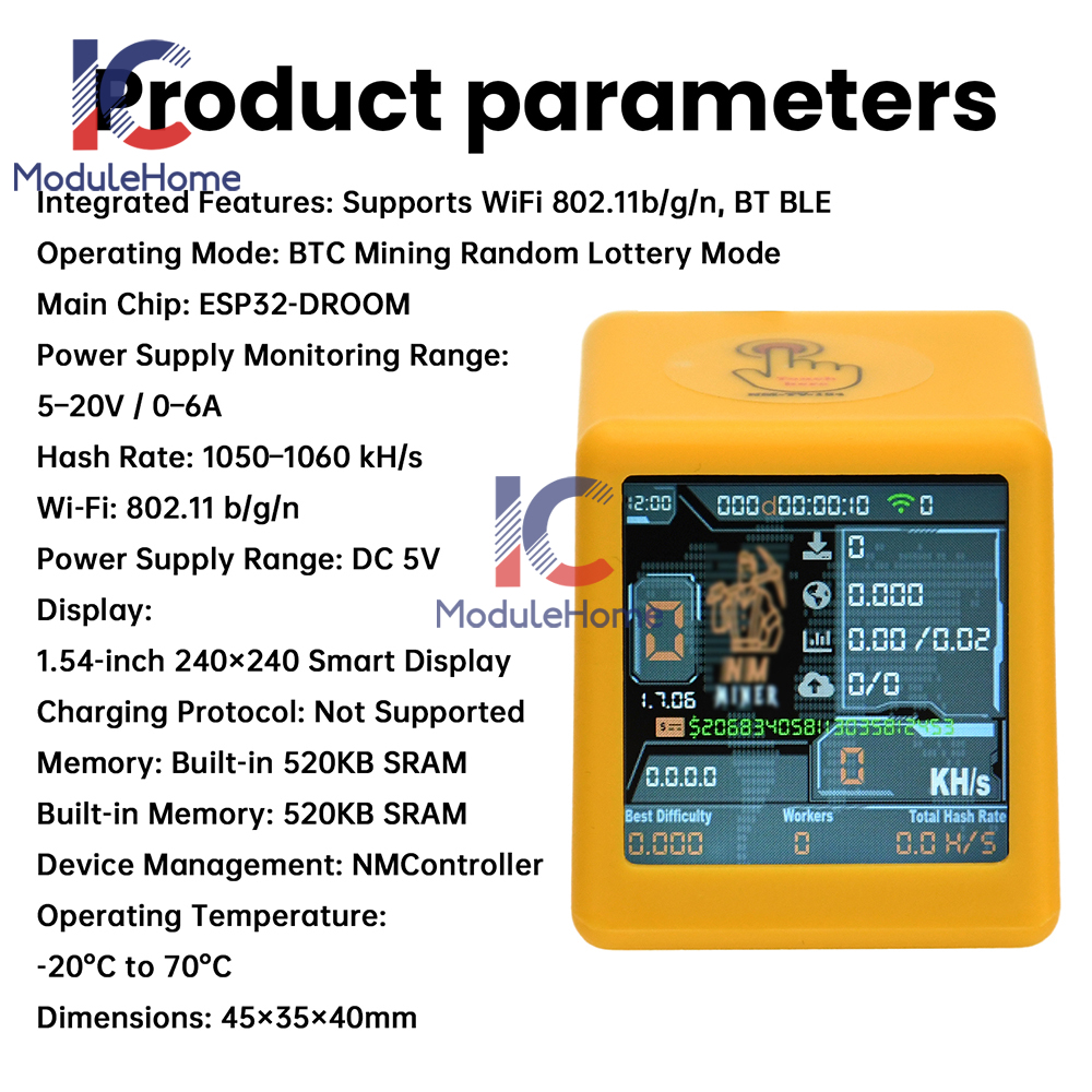 Performances de hashrate élevées : offrant 1 050 à 1 060 KH/s, ce mineur atteint environ 20 fois la puissance d'un mineur standard, exploitant efficacement Bitcoin et Dogecoin pour des récompenses plus rapides. Description du produit Dpofirs Bitcoin Loterie Mineur 1050 KH/s | Plug & Play avec affichage double mode, extraction WiFi Bluetooth pour Bitcoin, puce ESP32 économe en énergie 1., Performances de hashrate élevées : offrant 1 050 à 1 060 KH/s, ce mineur atteint environ 20 fois la puissance d'un mineur standard, exploitant efficacement le Bitcoin et pour des récompenses plus rapides., 2., Deux modes : équipé d'un écran HD de 1,54 pouces, permettant aux utilisateurs de basculer de manière transparente entre l'état minier et l'horloge de bureau pour à la fois pratique et esthétique., 3., Configuration Plug and Play facile : le mineur BTC nécessite uniquement une alimentation USB et une connexion WiFi ou Bluetooth, avec une configuration effectuée en moins de 5 minutes, le rendant accessible aux utilisateurs de tous niveaux techniques., 4., Puce robuste à faible consommation : prend en charge la puce à faible consommation ESP32-D0, capable de fonctionner de manière stable à des températures extrêmes allant de -20°C à 70°C, garantissant des performances minières continues., 5., Prise en charge conviviale du micrologiciel : prise en charge du micrologiciel NMMiner, prise en charge du flashage en ligne et de la récupération de licence, éliminant le besoin d'activation manuelle et améliorant la facilité d'utilisation. Deux modes : équipé d'un écran HD de 1,54 pouces, permettant aux utilisateurs de basculer en toute transparence entre « état minier » et « horloge de bureau » pour des raisons à la fois pratiques et esthétiques. Altcoins : IP et Monero s'envolent alors que les Memecoins plongent - Actu Crypto .info Puce robuste à faible consommation : prend en charge la puce ESP32-D0 à faible consommation, capable de fonctionner de manière stable à des températures extrêmes allant de -20 °C à 70 °C, garantissant des performances minières continues. Installation compacte et facile : avec son design compact, ce mineur de loterie Bitcoin Solos est facile à configurer, offrant une expérience plug and play adaptée aux utilisateurs de niveaux de compétences techniques Mineur à Faible Consommation ESP32 Dpofirs Bitcoin Lottery Miner 1050 KH/s | Plug & Play Mit Dual Mode Display, WiFi Bluetooth Mining Für Bitcoin, Energieeffizienter ESP32 Chip Mineur Hashrate 1050 Kh/s Esp32 Dpofirs Convertidor Bnc a Rj45, Conector de Eje de Cobre Dual Bnc...