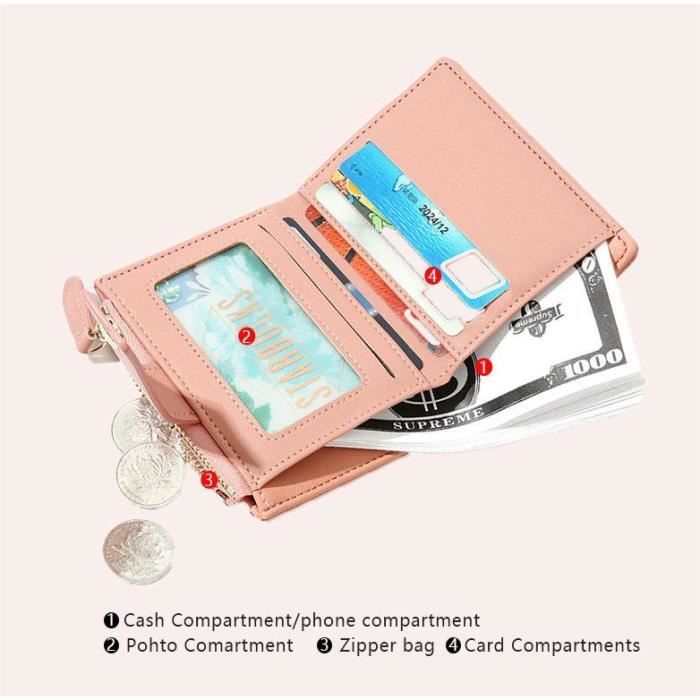 Sa finition soignée et son design moderne en font un compagnon de confiance pour organiser vos essentiels avec style., 1., Petit format et design compact Ce portefeuille pour femme offre un format réduit, idéal pour transporter facilement cartes, billets et pièces sans encombrement., 2., Cuir PU souple et résistant Fabriqué en cuir PU de haute qualité, ce porte-monnaie allie élégance et durabilité, parfait pour un usage quotidien., 3., Multiples porte-cartes pratiques Dispose de plusieurs emplacements pour cartes bancaires, cartes d'identité et autres cartes essentielles, gardées bien organisées., 4., Pochette zippée sécurisée avec bracelet Le compartiment à monnaie avec fermeture éclair assure la sécurité de vos pièces, tandis que le bracelet amovible facilite le transport., 5., Pliable et polyvalent Conçu pour se plier facilement, ce portefeuille compact convient à toutes les occasions, du quotidien aux sorties spéciales. Découvrez ce portefeuille femme petit format en cuir PU souple, alliant élégance et praticité. Sa pochette zippée sécurisée permet de ranger vos pièces et billets en toute tranquillité. Porte Carte Femme Cuir Veritable REETEE Porte Monnaie Femme En PU Cuir s Pour Femmes Petit Format Courte Portefeuille Femme Porte-chu00e9quiers Porte -Cartes 7 Emplacements Pour Cartes Et Zippu00e9 Pochette U00e0 Monnaie, Rose Petit mais spacieux: Le portefeuille court femme dispose de 6 emplacements pour cartes (y compris 1 fenêtre d'identité), 1 compartiments sur toute la longueur, 1 poche zippée. une poche principale pour les billets Porte-monnaie cuir format identité compact 4 poches - Monnaie - Clé - Carte crédit - Billet... portefeuille petit à triplé pour femmes - porte-cartes transparent, idéal pour étudiantes, bureau ou famille - cadeau d'anniversaire, saint-valentin ou - ensemble de 1 pièce | Achetez Plus, Économisez Plus