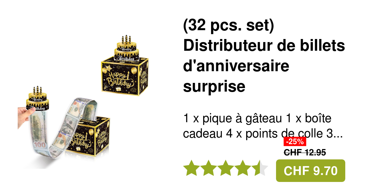 【Surprise d'Anniversaire】Des cadeaux surprises judicieux pour le jour spécial d'un anniversaire. Parcourez notre sélection de boîte cadeau surprise : vous y trouverez les meilleures pièces uniques ou personnalisées de nos boutiques KASESSS 4 Pièces Boîte à Billets Cadeau, Boîte Cadeau Surprise Happy Birthday, Boites Cadeau Anniversaire, Boîtes Surprise d'Anniversaire à Tirer DIY pour anniversaire, Amis, Famille, Enfants, Noir Caractéristiques: 1., Vous recevrez quatre boîtes-cadeaux surprises de type bonbon à languette, 40 sachets transparents, 8 rubans, 4 cartes à languette et 1 autocollant. Créez des moments inoubliables pour vos proches lors de leurs anniversaires spéciaux. Félicitations, votre tirelire surprise amusante est maintenant prête. Cette boîte cadeau faite à la main et remplie d'argent surprise est un excellent moyen d'exprimer votre amour et votre affection, et sera un accessoire accrocheur lors de votre fête d'anniversaire. Enroulez l'argent, tirez une extrémité du sac transparent hors de la fente du tiroir et attachez-la à la languette. Clé Différente 20mm - Serrure à came pour outil ou boîte à billets, armoire de gymnastique ATM... Vous devrez les assembler vous-même à la réception., 2., Voulez-vous offrir un cadeau surprise à votre famille et à vos amis? Il n'y a rien de plus excitant et surprenant que de recevoir une boîte-cadeau surprise avec de l'argent., 3., Un cadeau d'anniversaire parfait pour les femmes, les hommes, les enfants, les parents et les amis., Étapes d'utilisation: 1., Pliez la boîte d'argent surprise selon le pli, puis mettez l'argent dans le sac transparent, puis collez les sacs transparents., 2., Roulez l'argent, tirez une extrémité du sac transparent de la fente du tiroir et collez-le à l'onglet Pull. Boîte-cadeau Surprise pour anniversaire,boîte à billets ATM,décoration de gâteau amusant pour Boite A Cadeau Boîte à Tirer De L'Argent Joyeux Anniversaire, Créative Surprise Bricolage Boite Cadeau Anniversaire Pour La Famille, Les Amis, La Fête Boîte à Argent Anniversaire Confectionnez un cadeau d'anniversaire fait maison avec cette boîte à argent d'anniversaire remplie de cadeaux surprises. Spécifications du produit: matériel: papier Poids: 78 grammes par ensemble Couleur: noir Taille de l'emballage: 32x16x1cm Le package comprend: 4 x Boîte à Billets Cadeau Remarque: 1., Mesure manuelle, veuillez noter l'erreur de taille., 2., En raison des différences de couleurs, les couleurs peuvent varier entre les différents moniteurs. Ces images sont pour référence uniquement. 【Ensemble Raffiné】Vous recevrez un ensemble de quatre boîtes-cadeaux d'anniversaire, mesurant 19,5 x 5 x 5 cm, dans une palette de couleurs noir et or. Elles sont parfaites comme cadeaux surprises d'anniversaire pour tous les âges.