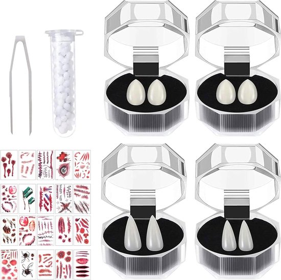 Dent De Vampire Dents De Vampire Halloween - 4 Tailles (13mm à Dents Vampire Adulte Accessoire Dentier De Vampire - Jour De Fête - Dents De Vampires - Accessoires Halloween Dents De Vampire Halloween Remarque: Assurez-vous de nettoyer soigneusement les pinces d'Halloween avec de l'eau douce savonnée et de l'eau courante avant utilisation Le forfait comprend : 4 paires de dents de vampire 4 pcs tatouages halloween 1 tube adhésif solide 1 pincée Spécifications : Couleur: beige Taille: 13mm, 15mm, 17mm, 19mm Caractéristiques : Matériel de résine premium: Ces dents de vampire sont faites de résine de haute qualité, non toxique, sans odeur pour un ajustement réaliste et confortable. Matériel premium: Nos dents de vampire GWAWG sont fabriquées en résine de haute qualité, elles sont non toxiques, sans goût, hygiéniques, sûres sur les dents et semblent réalistes Applications étendues: Ces pinces de vampire et tatouages d'Halloween sont parfaits pour Halloween, cosplay, spectacles de scène et fêtes à thème. Idéal pour les vampires, les loups-garous ou les zombies, ils ajoutent une touche effrayante à tout costume Facile à utiliser: Pour vous assurer que vous pouvez facilement maîtriser cette pince dents. Que ce soit pour une fête costumée, Halloween ou simplement pour s'amuser entre amis, laissez libre cours à votre créativité et incarnez le vampire de vos rêves Applications étendues: Ces pinces de vampire et tatouages d'Halloween sont parfaits pour Halloween, cosplay, spectacles de scène et fêtes à thème. Facile à porter: Suivez les étapes illustrées pour un look vampire rapide et cool.
