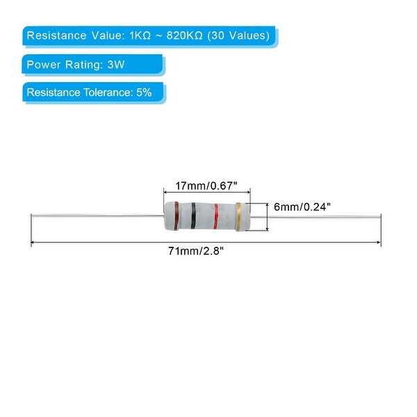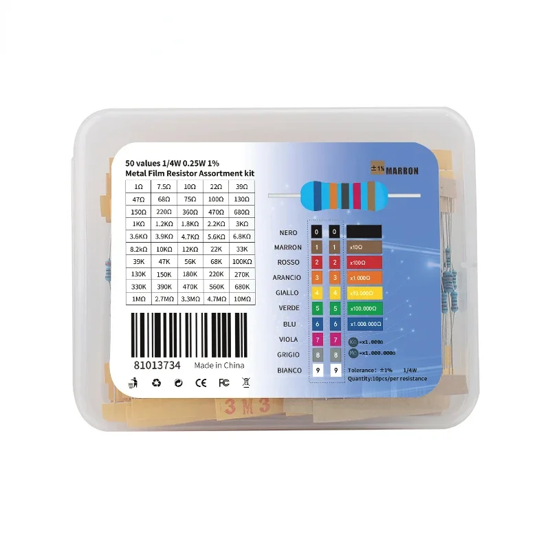Assortiment Résistances 1W Film Carbone 300pcs Pellicule Résistance Assortiment Trousse 0.1 Ohm - 750 Ohm, 30 Résistances Carbone 1W Instruction: Ces kits de résistances comprennent 30 valeurs différentes: 1KΩ,10KΩ,1., 5KΩ,100KΩ,15KΩ,150KΩ,2KΩ,20KΩ,200KΩ,2., 7KΩ,27KΩ,270KΩ,3., 3KΩ,33KΩ,330KΩ,3., 9KΩ,39KΩ,390KΩ,4., 7KΩ,47KΩ,470KΩ,5., 6KΩ,56KΩ,560KΩ,7., 5KΩ,75KΩ,750KΩ,8., 2KΩ,82KΩ,820KΩ. Ellenállás: 1K-820K - 300db Ellenállás készlet 1/2W 1% 30érték X 10db Fémfólia Ellenállás 0,1... Grande plage de fonctionnement, stabilité à long terme, faible tolérance, faible bruit et coefficient de résistance à basse température, c'est-à-dire que la résistance ne change pas rapidement avec un changement de température Faites attention au Plumbum pointu pour éviter les rayures. REMARQUE: Ce produit est petit, merci de le tenir éloigné des enfants de moins de 3 ans. Kit Résistances Axiales 300 Résistances 1K Ohm 1/4W - Film Carbone Performances stables élevées, température de fonctionnement élevée et haute tension ultime. La résistance à film de carbone est amplement employée dans les circuits électroniques, les composants électroniques, les radios, les télévisions, les ordinateurs et divers mètres. SpécificationType: Résistance à film de carboneMatériau: Film de carbonePuissance nominale: 1WValeur de résistance: 1KΩ ~ 820KΩ (30 valeurs)Tolérance de résistance: 5%Dimension du corps: 3,5 x 11mm/0,14 x 0,43 pouce (D*L)Longueur totale(Approx. InstructionCes kits de résistance comprennent 30 valeurs différentes: 1KΩ, 10KΩ, 1,5KΩ, 100KΩ, 15KΩ, 150KΩ, 2KΩ, 20KΩ, 200K, 2,7KΩ, 27KΩ, 270KΩ, 3., 3KΩ, 33KΩ, 330KΩ, 3., 9KΩ, 39KΩ, 390K, 4., 7KΩ, 47KΩ, 470KΩ, 5., 6KΩ, 56KΩ, 560KΩ, 7., 5KΩ, 75KΩ, 750KΩ, 8., 2KΩ, 82KΩ, 820KΩ. ): 61mm/2,4 poucesCouleur: As PictureListe de colisage: 300pcs( 10pcs*30 valeurs) x Résistances à film de carboneAvantageTypical Axial Leads, haute résistance, petite dimension, faible bruit, ont une longue durée d'utilisation Grande gamme de différentes valeurs de résistance pour servir vos diverses exigences. Large gamme de valeurs de résistance différentes pour répondre à vos diverses exigences. Avantages: Conducteurs axiaux typiques, haute résistance, petite dimension, faible bruit, longue durée d'emploi. Ce serait un composant fiable pour les projets électroniques et les programmes de test.