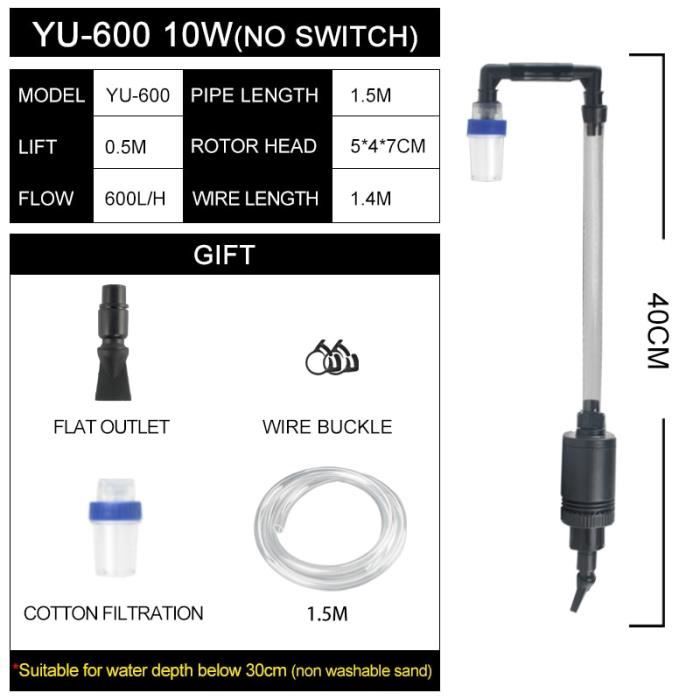 Il élimine efficacement les débris et la saleté, offrant un environnement propre et propre pour vos animaux aquatiques. Il dispose d'une pompe facile à utiliser qui nettoie efficacement l'aquarium, ce qui rend l'entretien sans effort. Pompes à eau pour aquariums : critères de choix décisifs Découvrez dans cette sélection les différents modèles selon votre aquarium et vos besoins Longueur pratique : avec une longueur d'environ 43 m, cette pompe de nettoyage vous offre suffisamment de portée pour nettoyer chaque coin de votre aquarium sans tracas. AQUARIUM FILTRE SUBMERSIBLE POMPE À EAU ÉTANG À POISSONS FONTAINE SILENCIEUX POMPE DE CHANGEMENT D'EAU 110V 240V 35W ACCESSOIRES DE RÉSERVOIR DE POISSONS – SÉNÉGAL 【 et fiable 】 Fabriqué à partir de plastique, ce nettoyeur d'aquarium est conçu pour durer. Sa construction robuste assure durabilité et fiabilité, vous donnant la tranquillité d'esprit pendant le nettoyage. Aspirateur à Déchets Pour Poisson Pompe à Eau Pour Aquarium, 400 L-H 5 W Pompe Submersible Pompe D Nettoyage Gravier Aquarium Améliore l'environnement de vie : gardez votre aquarium propre avec ce siphon changeur d'eau sous vide. Caractéristiques : Longueur : environ 1,43 m., Matériau : plastique., Couleur : blanc. Contenu de l'emballage : 1 pompe d'aspirateur pour aquarium.