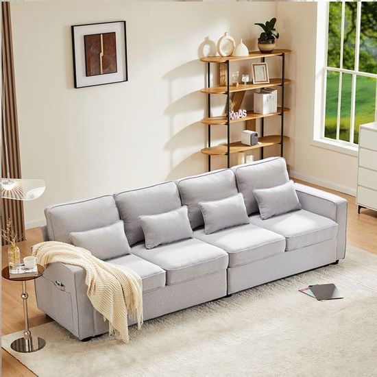 Design ergonomique avec support maximum : les dossiers hauts et les coussins généreux assurent un soutien total au dos. Tissu en lin de haute qualité : le revêtement en lin garantit un environnement frais et confortable même pendant les longues assises. Canapé 4 places moderne en tissu lin – avec console centrale, 2 porte-gobelets, 2 ports usb de charge, poches d’accoudoirs et 4 coussins, idéal pour salon, appartement ou bureau Canapé 4 places, canapé 4 personnes, canapé capitonné gris en lin avec... Dans ces compartiments pratiques, vous pouvez facilement ranger votre télécommande, vos magazines ou votre smartphone. Canapé Moderne 4 Places En Tissu Lin, Canapé Quatre Places Avec Poches Daccoudoir Et 4 Coussins Canape De Style Simple Adapte Pour Le Salon Lappartement Le Bureau 3 Options De Couleurs Pour Les 85922412 Le canapé est équipé d'un port USB pour connecter des appareils électroniques câblés et de 2 porte-gobelets pour verres ou boissons, etc. Que vous préfériez un look moderne ou traditionnel, son design raffiné en fait un élément d'ameublement polyvalent, capable de s'harmoniser parfaitement avec les meubles existants. Canapé Moderne 4 Places En Tissu Lin, Canapé Quatre Places Avec Poches Daccoudoir Et 4 Coussins Canape De Style Simple Adapte Pour Le Salon Lappartement Le Bureau 3 Options De Couleurs Pour Les 85922412 Cet excellent matériau est connu pour être respirant et durable dans le temps, tout en gardant votre canapé en parfait état et en ajoutant une touche de classe à votre décoration de salon. Grande capacité et confort pour tous : conçu pour accueillir confortablement quatre ou cinq personnes, ce canapé est idéal pour des moments de partage avec votre famille et vos amis. La généreuse largeur et l'ambiance accueillante qu'il offre en font le complément parfait à votre salon, en le transformant en un point focal de convivialité et d'intimité à la maison.