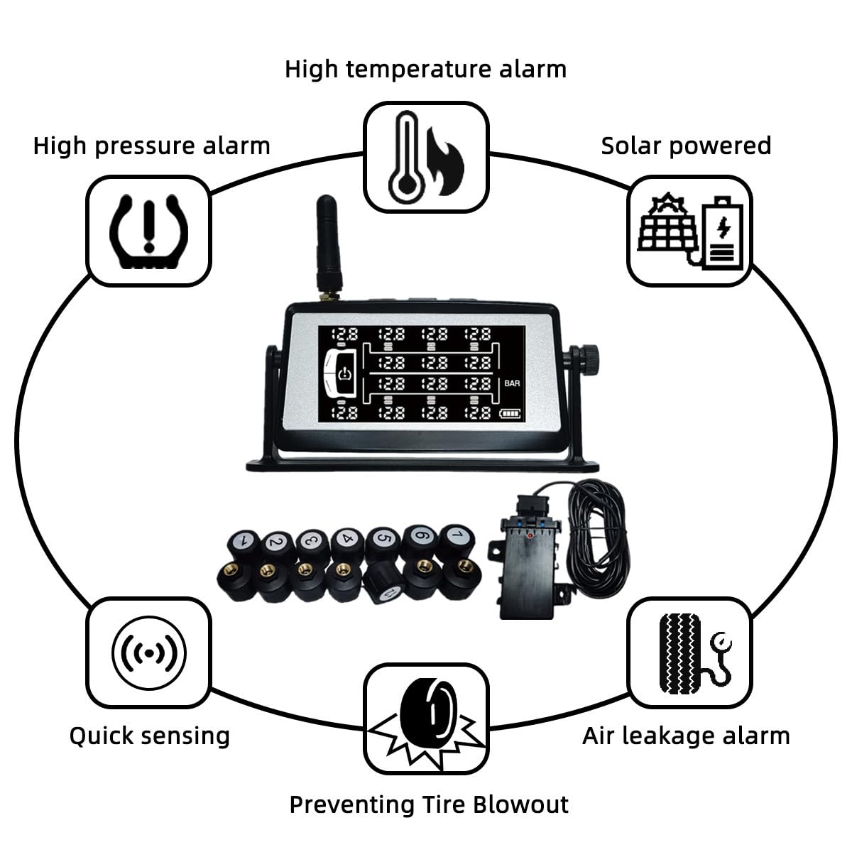 Types de véhicules concernés : Le système solaire de surveillance de la pression des pneus KAOLALI convient à la plupart des véhicules à 4 roues : berline, SUV, MPV, VAN, camionnette, véhicule récréatif, etc. Lot de 4 Capteurs de Pression des Pneus TPMS 52933-3V600 pour Grandeur Système de surveillance de la pression des pneus solaire TPMS pour voiture – Affichage sans fil avec alarme de température et de pression, chargement USB, 4 capteurs Le moniteur configure automatiquement la pression actuelle comme point de référence lorsque les capteurs de pneu sont installés. Assurez-vous que le moniteur est allumé avant d'installer les capteurs. Il n'est pas nécessaire de régler manuellement la valeur d'alerte de haute et basse pression, ce qui est intelligent et pratique Six modes d'alarme et réglage automatique des valeurs d'alarme : KAOLALI TPMS peut surveiller en temps réel la pression et la température de 4 pneus en même temps. Nous soutenons un service de retour et d'échange de 2 ans. Système de contrôle de la Pression des pneus Vidéo de marchand Moniteur Pression Pneus Voiture Camion Camping-car Système De Surveillance De La Pression Des Pneus Sans Fil Pour Moto Tpms De Charge Usb Pour Moto Avec 2 Capteurs Externes Affichage Lcd Numerique Tpms Pour Moto A Deux Rouesde Debuns 84600475 TPMS Alarme Pression Température Moniteur : la pression PSI/Bar et la température C/F sont sélectionnables/veille et réveil automatiques en fonction des vibrations. Six modes d'alarme et réglage automatique des valeurs d'alarme : KAOLALI TPMS peut surveiller en temps réel la pression et la température de 4 pneus en même temps. Forte plage de détection de la pression et transmission... Ce TPMS est livré avec 2 batteries supplémentaires, ce qui vous permet de remplacer les capteurs vides à temps pour assurer un fonctionnement continu La distance maximale entre le capteur et l'écran ne doit pas dépasser 10 mètres. Le manuel électronique est disponible en anglais, allemand, français, italien et espagnol. Capteurs : 2 ans de durée de vie de la batterie avec une pile CR1632 remplaçable/±1,5psi de précision de pression élevée/conception antivol et étanche. C'est un excellent accessoire pour votre voyage en camping-car. Toutes les données de pression et de température apparaîtront sur l'écran après l'installation des capteurs, si ce n'est pas le cas, conduisez la voiture pendant 5~10 minutes pour activer les capteurs, puis le moniteur affichera toutes les données Les capteurs TPMS ont été programmés avec le moniteur avant de quitter l'usine, l'utilisateur doit juste installer les capteurs en suivant les marques de position sur eux. Lorsque l'icône d'alimentation du moniteur clignote et qu'il n'y a pas de lumière du soleil, utilisez le câble USB fourni pour charger le moniteur.