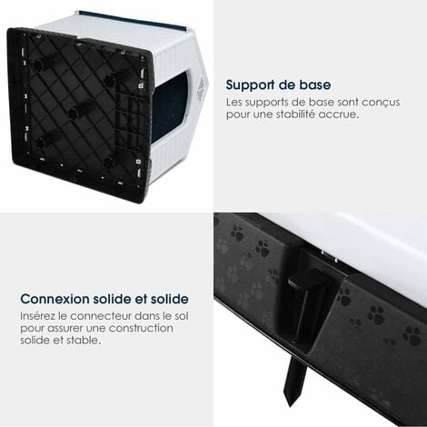 Caractéristiques : Matériau PP sélectionné facile à entretenir et durable Porte verrouillable pour empêcher les animaux de s'échapper et contrôler leur accès Aérateurs sur 3 côtés pour favoriser la ventilation Support de base stable assurant une fondation fiable Base imperméable avec trous de drainage pour garder un espace intérieur sec Toit incliné favorisant le drainage Assemblage facile sans outils supplémentaires Panneaux détachables empilables pour le rangement Convient à divers animaux, tels que chien, chat, lapin ou poulet Adapté pour intérieur et extérieur Spécifications : Couleur: Comme illustré Matériau: PP, Métal Dimensions du produit: 66,5 x 52 x 60 cm (L x l x H) Taille de la porte: 40 x 25 cm (L x l) Taille intérieure: 57,5 x 42,5 x 56 cm (L x l x H) Poids net: 4 kg Contenu de l'emballage : 1 x Niche pour chien 1 x Manuel Mode d'emploi Veuillez éviter toute exposition prolongée à la pluie. Fabriquée à partir de matériau PP de haute qualité, la cage pour chien en plastique est conçue pour durer. La porte verrouillable garde votre animal en sécurité tout en offrant un accès facile Description du produit Offrez à votre animal un abri confortable et sécurisé avec la niche en plastique. 【Abris Polyvalent pour Animaux】Avec une taille intérieure de 57,5 x 42,5 x 56 cm, la niche pour chien est suffisamment spacieuse pour les petites races. De plus, la base imperméable avec des trous de drainage empêche l'eau de s'infiltrer dans la maison. Équipée de 2 verrous, la porte peut être ouverte depuis la droite ou la gauche. Avec des aérations sur 3 murs, votre animal peut profiter d'un environnement bien ventilé. Selon sa taille et selon sa race, il existe de nombreux modèles de niches pour chiens parmi lesquelles vous trouverez forcément celle qui fera le bonheur de votre compagnon à quatre pattes Fabriquée à partir de matériau PP de haute qualité, la cage pour chien en plastique est conçue pour durer. COSTWAY Cage pour Chien 2 en 1 de Petite et Moyenne Taille, Plateau Maison Chien Extérieur Intérieur COSTWAY Niche Pour Chien Avec Porte Verrouillable, Abri Pour Animaux Niche Chat Extérieur De plus, le matériau léger permet une mobilité et un transport aisés. La porte verrouillable garde votre animal en sécurité tout en offrant un accès facile. De plus, la base surélevée avec pieds stables assure l'équilibre, tandis que les trous de drainage maintiennent l'intérieur sec et confortable. Avec 3 fenêtres pour la ventilation et l'entrée de lumière, la maison pour animaux crée un environnement agréable pour vos amis à fourrure. En outre, le toit incliné est conçu pour un drainage efficace de l'eau.