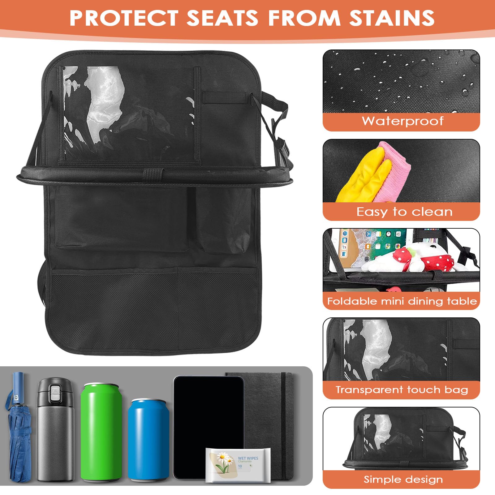 Il peut servir de table à manger ou de support pour tablette pour manger ou travailler. Plateau pliable amélioré] Ce organisateur voiture enfant pour siège auto est équipé d'un plateau pliable. Il facilite l'utilisation de la table pliante pour les repas et les loisirs. Il peut servir de table à manger ou de support pour tablette pour manger ou travailler Lorsqu'il n'est pas utilisé, il se replie pour un gain de place. 【Sac de rangement multifonction】 équipé de 6 sacs de rangement de différentes tailles et d'une table pliante, il vous offre plus d'espace de rangement pour ranger plus d'objets. Elle s'adapte à la plupart des sièges auto, voitures, berlines quatre portes, jeeps, SUV, etc. Protection Voiture URAQT Organisateur De Voiture, Organisateur Voiture Enfant Avec 8 Poches, Protection Siege Voiture Enfant Super Capacitu00e9 Avec Pochette Transparente Pour Tablette IPad Bouteilles Jouets Livre, 2 Piu00e8ces Support Ipad Voiture Facile à nettoyer et à sécher rapidement, il est donc facile d'entretien. L'écran tactile est contrôlé par un sac transparent, adapté à la plupart des téléphones portables et des petites tablettes. 【Protection de sécurité】 La protection de siège auto protège le siège auto des dommages et de la saleté, vous évitant ainsi des frais de nettoyage élevés. Il est facile à retirer pour le lavage. Organisateur Siège Enfants,Organisateur Voiture Enfant,Voiture Kick Mats,Rangement Auto Installez d'abord la sangle, puis ouvrez le mousqueton pour l'installer sur le siège, ajustez la longueur et l'installation est terminée ! L'écran tactile est contrôlé par un sac transparent, adapté à la plupart des téléphones portables et des petites tablettes. Notre sac de rangement pour voiture pour enfant peut contenir livres, jouets, gobelets, mouchoirs, etc