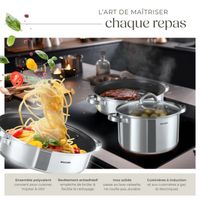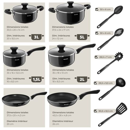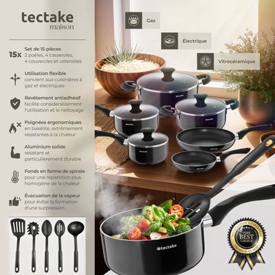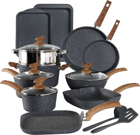 ENSEMBLE COMPLET ET POLYVALENT - Cette batterie cuisine induction de 17 pièces de tectake comprend tout ce qu'il vous faut. Grande poêle Dimensions : avec poignée et couvercle 44 x 27,5 x 13 cm / intérieures (ØxH) 26 x 6,5 cm, Volume : 3,4 L, Poids : 0,65 kg Petite poêle Dimensions : avec poignée et couvercle 38 x 21,5 x 9,5 cm / intérieures (ØxH) 20 x 4,5 cm, Volume : 1,4 L, Poids : 0,4 kg VAISSELLE ET ENTRETIEN FACILES : Cette batterie de cuisine est compatible avec le lave-vaisselle (lavage à la main recommandé). Faciles à fixer, elles offrent un gain de place pour le rangement de vos poeles et casseroles pour induction et une flexibilité maximale, en particulier pour les petits espaces ou pour le lave-vaisselle. Kuhn Rikon Cassel Batterie De Cuisine 12 PCs, 3 Poêles À Frire 20,24,28 Et Gril Moma Tectake Noir Antiadhésif Le fond spiralé assure une répartition uniforme de la chaleur pour des résultats parfaits, que ce soit sur induction, gaz ou plaques électriques. Les 2 couvercles en silicone sont idéaux pour stocker les restes ou conserver les aliments directement dans la casserole ou la poêle, tout en préservant la fraîcheur. Poignée Dimensions totales : 18,5 x 4 x 5 cm, Poids : 0,2 kg PRATIQUE ET FLEXIBLE AVEC POIGNÉES AMOVIBLES - Les poignées amovibles en bakélite résistante à la chaleur vous permettent d’ajuster l’ensemble selon vos besoins. De Buyer poêles à frire en fer minéral 3-pack - Mineral Series B Données techniques :Poêle à griller Dimensions : avec poignée 46,5 x 30 x 8,5 cm / intérieures 28 x 28 x 4 cm, Volume : 2,9 L, Poids : 1,1 kg Grand couvercle (ØxH) : 27 x 4 cm Petit couvercle (ØxH) : 21 x 4 cm Grande protection en silicone : 23 x 21,5 x 0,5 cm Petite protection en silicone : 19,5 x 17,5 x 0,5 cm Protège-casserole (Ø) : 38 cm Matériaux : aluminium avec revêtement antiadhésif, verre, silicone, nylon, bakélite, polyester, acier inoxydable Contenu : 3 poêles à frire, poêle à griller, 2 casseroles, 2 poignées, 2 couvercles de casserole, 2 couvercles en silicone, 5 protège-casseroles, Notice De plus, cette batterie casserole induction est résistante au four jusqu’à 175°C. Grande casserole Dimensions : avec couvercle (ØxH) 21,5 x 9,5 cm / intérieures (ØxH) 20 x 9 cm, Volume : 2,8 L, Poids : 0,55 kg Set 3 poêles à frire 4 boîtes à lunch 3 ustensiles Casseroles Et Poêles De Cuisine Poêle À Crêpes Poêles Ovales En Fonte Avec 3 poêles à frire, 1 poêle à griller, 2 casseroles, 2 couvercles en verre, 2 en silicone, 2 poignées amovibles, et 5 protège casseroles, ce set est adapté à tous vos ustensiles de cuisine sur induction, gaziniere et plaques vitrocéramique et électrique.