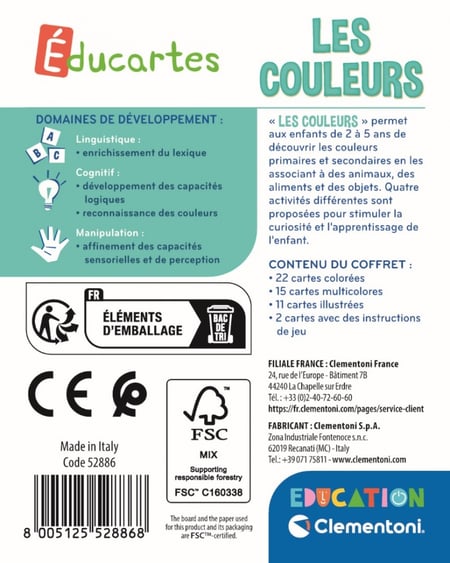 Sapientino My English World oktatójáték - Clementoni - Iskolatáskanet Contenu : 1 affiche avec 2 scénarios de jeu, 55 cartes illustrées avec mot en anglais, guide avec les astuces de jeu Jeu 4+ Ans éducatif Clementoni 16098 Montessori Le Lettre Jeu éducatif Multicolore - Jeux - Jouets Jeu Vocabulaire Enfants Un jeu amusant avec de nombreuses histoires à découvrir et à inventer pour apprendre de manière facile et ludique plus de 50 mots en anglais un monde entier fait d'objets à placer dans les environnements auxquels ils appartiennent, pour s'amuser et découvrir de nombreux nouveaux mots. Âge recommandé : préscolaire - enfants de 4 à 6 ans Type : jeu amusant pour stimuler le langage et l'exercice de la pensée pour les images JEU SAPIENTINO CORPS Humain Et Sport Clementoni EUR 7,81 - PicClick FR Clementoni Sapientino Le Mie Prime 100 Parole – Gioco Educativo 2-4 Anni con 50 Carte in Description : un jeu amusant avec de nombreuses histoires à découvrir et à inventer pour apprendre de manière facile et ludique plus de 50 mots en anglais Catégorie : Jeux éducatifs Stimule le langage et l'exercice de la pensée par images.