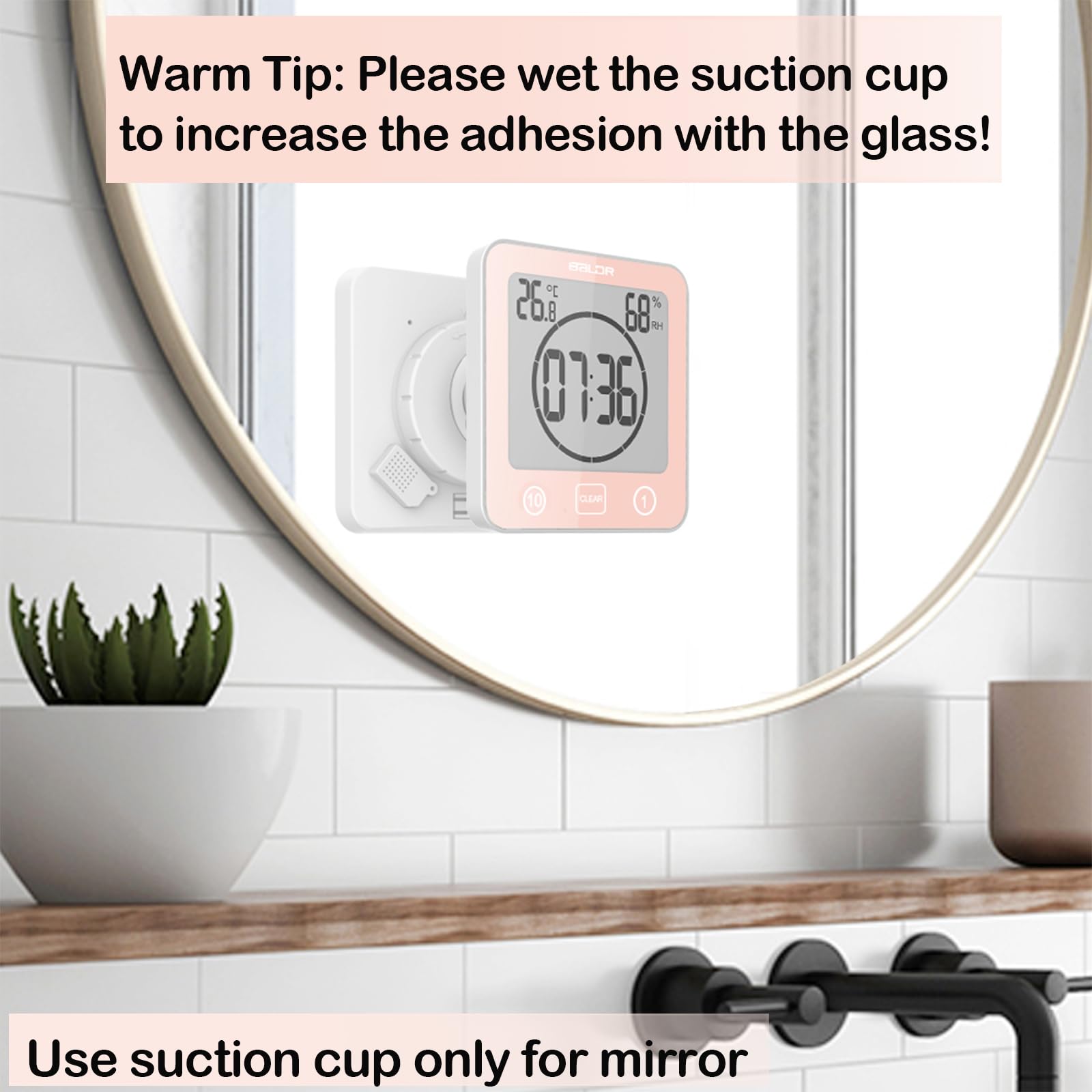 Conception compacte et fonctionnelle: Cette petite horloge numérique économe en espace s'intègre facilement dans n'importe quelle salle de bain, offrant l'équilibre parfait entre les fonctionnalités essentielles et la conception minimaliste, ce qui le rend parfait pour les espaces serrés. Horloge murale numérique Fonctionne, horloge de salle de bain imperméable avec aspiration, petite horloge numérique multifonctionnelle avec date, temps et température pour la salle de bain Description: Cette horloge de salle de bain numérique polyvalente est conçue pour la vie moderne., ., Son design compact et élégant offre un grand écran LCD facile à lire qui montre non seulement l'heure, mais aussi la date et la température., ., L'horloge est entièrement étanche avec une note IPX7, ce qui le rend idéal pour une utilisation dans les salles de bains torrides, les stands de douche ou les zones humides., ., Son accessoire de ventouse garantit une installation facile et vous permet de le monter en toute sécurité sur des miroirs, du verre ou des tuiles, éliminant le besoin de vis ou de forage., ., La conception multifonctionnelle en fait un ajout parfait à toute salle de bain ou salle de bain, vous aidant à rester au-dessus de votre routine tout en gardant votre environnement à l'aise avec les lectures de température., ., Idéal pour les petits espaces, il ajoute une commodité pratique à votre décoration intérieure., ., Fonctionnalité:., ., Horloge de salle de bain., ., Couleur: argent., ., MATÉRIEL: Aluminium., ., Taille: 14., 7x14., 7x6., 5 cm / 5., 8x5., 8x2,6 pouces., ., Affichage du diamètre de l'écran: 10,8 cm / 4,3 pouces., ., Alimentation: 1 x AA Batterie (pas inclure)., ., Remarque: 1., En raison de différentes conditions d'éclairage, veuillez autoriser une légère déviation pour la couleur., ., 2., Veuillez prévoir des erreurs de 1 à 2 cm / 0,39-0,78 pouces en raison de la mesure manuelle différente., ., Package comprenant 1PC * Corloge de salle de bain Communie multifonctionnelle: Plus qu'un simple montre, cette horloge de salle de bain se double d'un détecteur de température, vous aidant à surveiller le confort de votre environnement tout en vous préparant ou en se détendant dans la salle de bain. Horloge de salle de bain - VGEBY - Imperméable - Ventouse - Design Affichage clair et lisible: le grand écran LCD offre une visibilité claire de l'heure, de la date et de la température, vous pouvez donc facilement suivre votre horaire et vos conditions de salle de bain en un coup d'œil. Cette petite horloge murale numérique étanche sera très pratique pour vous, vous pourrez la placer dans votre salle de bain, un endroit humide où les horloges normales peuvent se détériorer au contact de l’eau Horloge étanche IPX7 Horloge Murale Numérique, Affichage Du Calendrier Avec Télécommande, Grand Écran Numérique Pour Horloge Numérique Ventouse Ipx7 Affichage clair et lisible: le grand écran LCD offre une visibilité claire de l'heure, de la date et de la température, vous pouvez donc facilement suivre votre horaire et vos conditions de salle de bain en un coup d'œil