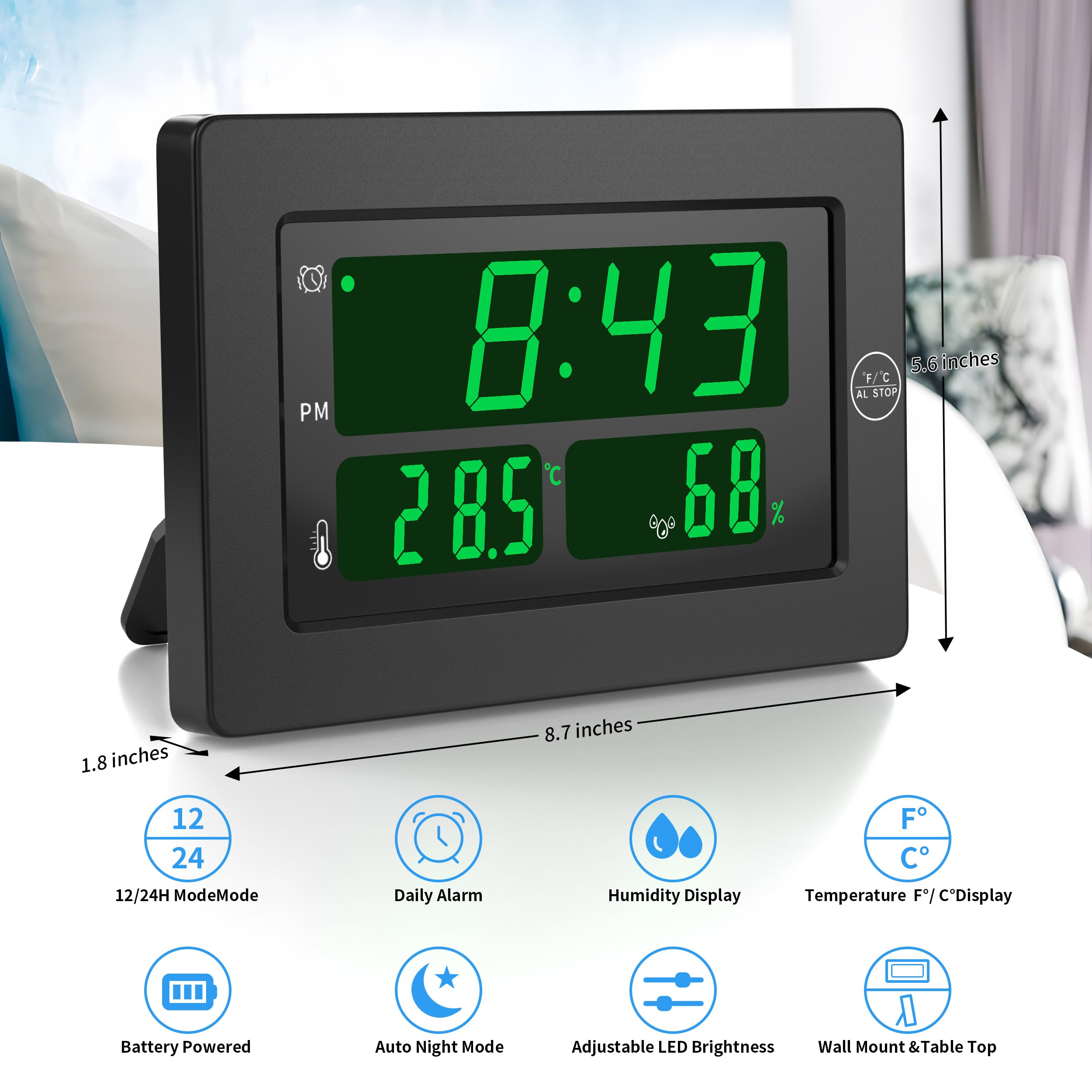 Humidité : 20-95%, résolution de 1%, précision de +-5 En plus d'afficher l'heure à la seconde près, l'horloge radiopilotée DCF indique également la date, le jour de la semaine et la température intérieure de la pièce sur l'écran LCD de 3,3" (8,34 cm) avec rétroéclairage LED bleu Valeurs recommandées température / humidité Utilisation intuitive grâce à 5 boutons. RÉTROÉCLAIRAGE RÉGLABLE L’heure reste parfaitement lisible la nuit : il suffit d’appuyer pour activer le rétroéclairage bleu. Inclut la mesure de la température et de l’humidité afin d’assurer un climat intérieur optimal et un sommeil réparateur., | 307171 Fonction snooze (pour env. Réveil Thermomètre Extérieur-intérieur Blanc | Réveil-Matin-Original Plage de mesure de la température : -10 à +50°C (précision(+/-1°C, résolution +/-0,1°C) Alarme (Auto-OFF après 2 minutes) Affichage de la date (jour et mois), affichage du jour, Heure (mode 12 / 24 heures) Mini Thermomètre Hygromètre Intérieur Digital à Haute Précision... Hygromètre Intérieur Grand écran Thermomètre Numérique De Haute Précision, 1 Pièce, Humidité, Horloge Réveil Grand écran 4 Pouces LCD 5 minutes) par fonction tactile