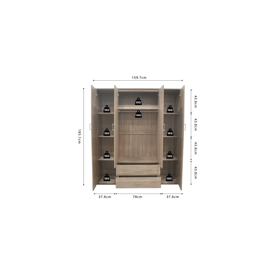 Montage : A monter soi-même - Instructions fournies , Garantie : 2 ans Une grande armoire fonctionnelle avec miroir et penderie intégréeApportez élégance et fonctionnalité à votre chambre avec l'armoire TOM 4 portes, un meuble au style contemporain et à la finition soignée Armoire TOM 4 portes avec miroirs - L160 cm - Couleur gris anthracite - Élégance et capacité XXL Optimisez l'organisation de votre chambre à coucher avec l'armoire TOM 4 portes avec miroir de couleur gris anthracite, ici dans sa version grand format 160 cm de large. Grande largeur (160 cm) idéale pour un rangement complet , Construction robuste et Panneaux de particules et MDF de première qualité Bel espace de rangement , Gris anthracite , 160 x 185 x 52 cm Parfait pour les grandes chambres à coucher, cette armoire design offre un grand espace intérieur : garde-robe, étagères et débarras, vous permettant d'organiser vos vêtements, accessoires et linge de manière optimale. Armoire 4 portes avec miroir et 6 tiroirs – STAR – Blanc – L264 cm Configuration : 2 portes pleines + 2 portes avec miroirs centraux , Nombre de colis : 2 Avec son design sobre et contemporain, il s'intègre harmonieusement dans tout intérieur moderne, ajoutant de la luminosité grâce au miroir intégré. Matière : MDF et panneaux de particules décoratifs + miroir , Couleur : Gris Anthracite Avec son design sobre et contemporain, elle s'intègre harmonieusement dans tout intérieur moderne, tout en ajoutant de la luminosité grâce à son miroir inté Armoire Design Gris Anthracite 160 Cm Armoire 4 Portes Avec 2 Miroirs TOM - Dimensions H185 X L160 X P52 Cm - Coloris Blanc - Style Armoire Tom Avec Miroir Intégré Dimensions : L160 x P52 x H185 cm