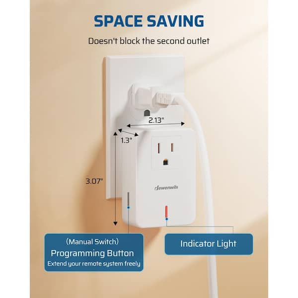DEWENWILS Prise de contrôle à distance intérieure, interrupteur d'éclairage à distance, sans interférence, sans câblage, 15 A/1875 W, portée RF de 30,5 m, design compact, programmable Même les personnes âgées peuvent facilement la maîtriser. Prise Sans Fil économie D'énergie Prises Programmable Telecommande Sans Fil, 30M De Distance De Contrôle Prise Télécommande Sans Fil FONCTION D'APPRENTISSAGE : Le kit de prises sans fil est préprogrammé, vous n'avez pas besoin d'apprendre ou de configurer le système vous-même ; Branchez simplement la prise et appuyez sur le bouton de la télécommande pour contrôler les appareils correspondants à distance. De plus, la télécommande a une portée de 30 mètres. Si vous ne voulez pas vous lever pour allumer ou éteindre l'interrupteur, vous pouvez facilement allumer et éteindre les prises de courant à l'aide de la télécommande. Pré-programmé et économe en énergie : l'émetteur et le récepteur sont préprogrammés pour une utilisation immédiate, pile CR2032 incluse ; la prise reste éteinte après une panne de courant et la consommation d'énergie en veille de la prise est de seulement 0,6 W, économe en énergie Prises Connectées Et Intelligentes Prises Telecommande Sans Fil 3680W,Prise Exterieure Etanche,Portée 30 M,4 Prises Et 1 Prise Connectée Les prises sans fil peuvent réduire la consommation d'énergie. TÉLÉCOMMANDE TRANSPORTABLE : La télécommande est pratique et facile à transporter. ÉCONOMIE D'ÉNERGIE : La consommation d'énergie en veille de la prise n'est que de 0,6 W.