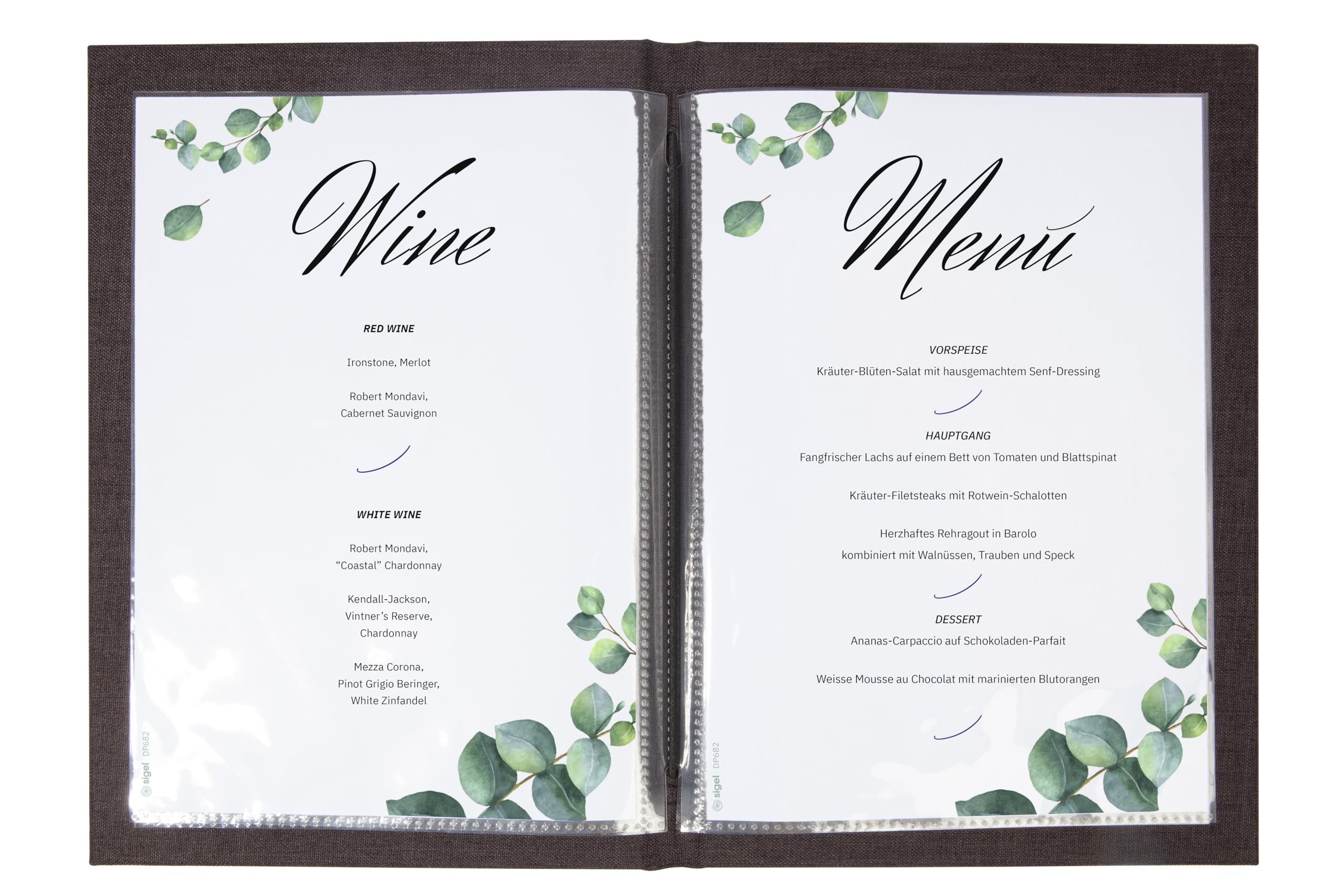 Couverture de haute qualité en matière PU (sans adoucissant), résistante à l'abrasion, à l'usure, aux rayures et déperlante Il est multi-usage et d'une grande longévité grâce à sa couverture résistante en RPET durable combinée à du bambou certifié FSC. Les meilleures offres pour Sigel SM221 Chemise pour menu DIN A5 1 pc (s) avec 2 pochettes transparentes sont sur Comparez les prix et les spécificités des produits neufs et d 'occasion Pleins d 'articles en livraison gratuite Cartes de menu avec liaison en caoutchouc, gris foncé/beige, adapté au format A5, en matériaux de haute qualité : polyéthylène (RPET) recyclé, bambou, polyuréthane (PU Chaque carte est fourni avec 2 pochettes transparentes 4 vues pour 8 fuilles A5 (14,8 x 21 cm) Protège menu - DAG STYLE - Lot de 5 - Format A4 - PVC - Couleur Blanc Porte-menu intemporel adapté à une utilisation dans la gastronomie, les hôtels, les cafés et les bars Lot de 5 Protège-menus avec couverture résistante, aspect lin élégant, facile à nettoyer; Dimensions produit : 17,50 x 24,50 x 1,20 cm Menu Gastronomie Durable SIGEL SM136/5 Lot De 5 Porte-menus Avec Reliure à Vis Pour Format A5, Noir Avec Structure En Lin élégante, Résistants Et Faciles à Nettoyer Protège-menus Restaurant Couverture Pochettes transparentes pour 8 feuilles incluses (des pochettes supplémentaires sont disponibles séparément chez SIGEL). Comme dit le proverbe : On mange aussi avec les yeux ! Ce protège-menu vous permet de présenter vos plats et boissons avec style.