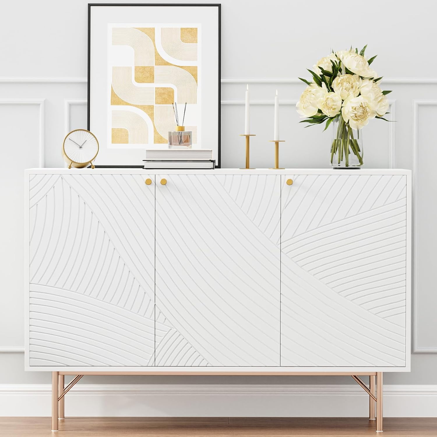 Idéal pour ranger vaisselle, livres, bouteilles ou accessoires, il peut servir de buffet, bar, meuble TV ou console d’entrée. ✅【 Design moderne et élégant】Avec ses panneaux geriffelés et sa façade brillante, ce buffet haut de 130 cm apporte un style contemporain et raffiné à votre intérieur. Buffet Moderne Salon PUGSDRLY Sideboard Living Room With 3 Doors, Living Room Buffet Blanc Pieds Dorés PUGSDRLY Chest of Drawers with 3 Drawers and 3 Doors, Living ✅ 【Matériau robuste et facile à entretenir】Fabriqué en panneau de particules de qualité, il est résistant, durable et facile à nettoyer. Service client disponible en cas de besoin. ✅ 【 Conception pratique et fonctionnelle】Les étagères ajustables s’adaptent à vos besoins. Un espace de 12 cm sous le meuble permet un passage facile pour le nettoyage. PUGSDRLY Meuble de Rangement avec 3 étagères MODULARITÉ INTELLIGENTE: Cette armoire de rangement est équipée de 3 étagères réglables en hauteur et entièrement amovibles Il s’adapte facilement au salon, à la salle à manger ou à l’entrée. Couleur : Blanc Matériau : Panneau de particules Position de mise en évidence : (La position de mise en évidence est limitée aux trois panneaux de la porte avant) Fonction : 3 portes ; pas de tiroirs Ouverture : Pas de poignée, pas de retour Conseils d'entretien : Essuyer avec un chiffon humide Tablettes réglables : Oui Quantité d'emballage : Deux paquets. Veuillez attendre que les deux colis arrivent en même temps afin de vérifier les composants avant l'assemblage et d'éviter les omissions Dispositif anti-basculement : oui