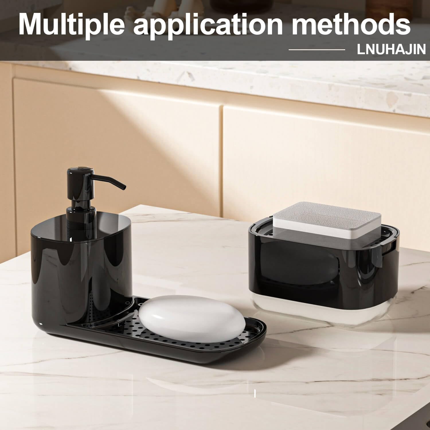 Kit de nettoyage pour évier qui combine un distributeur de savon pour lave-vaisselle, un distributeur de savon pour les mains et un organisateur pour placer le chiffon et l'éponge. 5919488 - Doseur, bac à produit pour lave-vaisselle La surface ne se décolore pas et ne se raye pas facilement. Résistant : résiste à tous les types d'agents chimiques sans altérer ses caractéristiques esthétiques et fonctionnelles. Présentation : livré dans une boîte et protégé par un plastique. Distributeur Double Réservoir 350ml Distributeur De Savon De Cuisine Noir Avec Doseur Pour Lave-Vaisselle Organisateur évier Avec Doseur Lave-vaisselle Réservoir pour savon pour les mains : 350 ml. Facile à nettoyer : le produit se monte et se démonte facilement avec les mains. Il peut être nettoyé complètement et rapidement. Dimensions : 17 x 10 x 17,5 cm Distributeur de Liquide Vaisselle pour la Cuisine, Distributeur de Multifonction : distributeur de savon de lave-vaisselle par pression de 350 ml, distributeur de savon pour les mains de 350 ml, espace de stockage pour l'éponge et support de séchage pour le chiffon. Ce set intègre un distributeur de liquide vaisselle à pression (450ml), une pompe pour savon mains (350ml), un compartiment ventilé pour l'éponge et une barre arrière pour sécher la lavette