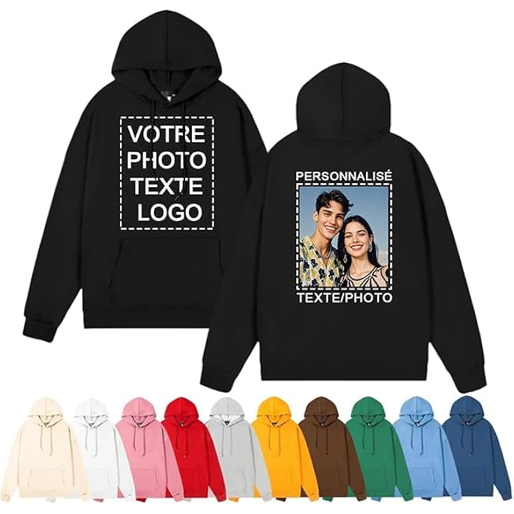 Sweat Personnalisable Couple PRFELMG Hoodie Personnalisé Ajoutez Votre Propre Photo/Texte, Hoodie Unisexe Hommes Femmes, Créez Votre Propre Nom Ou Logo, Sweat Personnalisé Pour Couple, Imprimé Devant/Dos/Manche Pull Couple Personnalisé Chez !, tu peux créer un sweat capuche personnalisé pour homme, femme ou unisexe. Grâce à notre outil de personnalisation, tu ajoutes facilement tes textes, photos ou logos pour transformer un simple vêtement en hoodie personnalisable unique L'impression all over recouvre l'ensemble du sweat à capuche, toutes coutures confondues, en y intégrant le motif de votre choix. Si vous avez envie de personnaliser votre sweat à capuche avec une touche premium, la broderie est en vogue et donnera un effet haut de gamme 1., Tissus en polyester chauds : Fabriqué en polyester, résistant à l’abrasion, infroissable., 2., Confortable à porter : Respirabilité et coupe douce et ajustée pour une sensation de confort., 3., Personnalisable : Devant et dos personnalisables pour créer un sweat-shirt unique., 4., Large gamme de couleurs : Des tons subtils aux tons vifs, pour s’adapter à les styles., 5., Tendance et polyvalent : Coupe classique à capuche et manches longues, idéale pour les loisirs et le sport., 6., Guide des tailles : Remarque : Mesurez-vous précisément et comparez-la à notre guide des tailles pour trouver la taille qui vous convient. Nevaou Sweat à Capuche Personnalisé - Concevez Votre Portrait à Partir de la Photo - Pour Hommes, Femmes, Couples - Sweatshirt Cadeau - Blanc, L/6XL