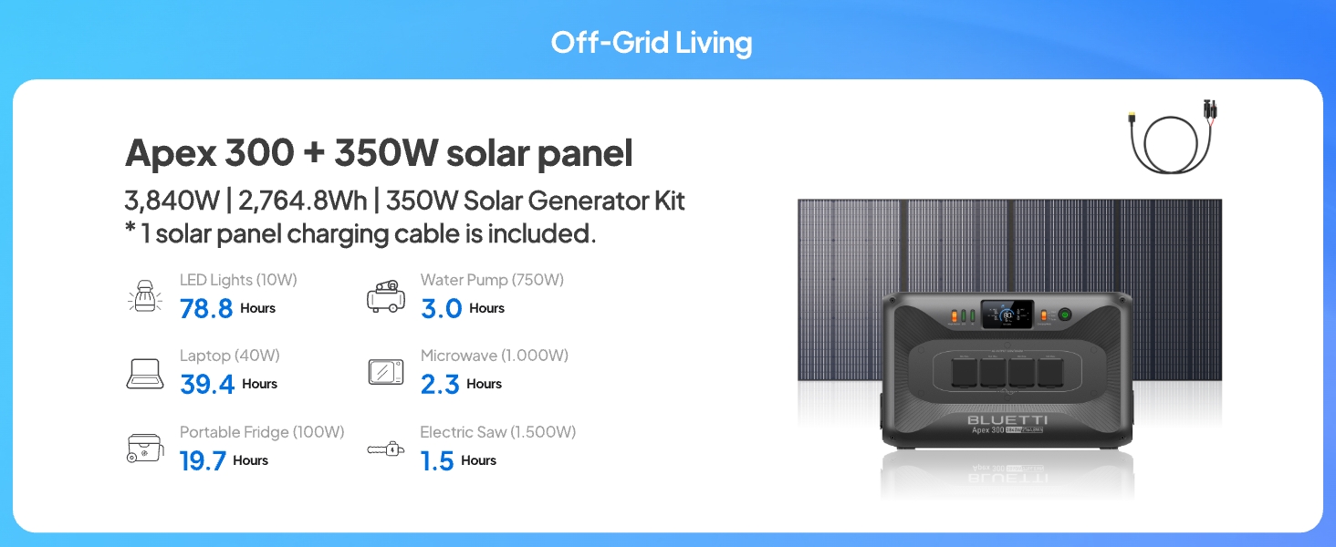 [Blazing Solar Charge] - BLUETTI Apex 300 achieves 2400W solar input with dual MPPT, charging to 80% in 40min at full power. Avec jusqu'à 4 000 W d'entrée solaire, l'Apex 300 vous aide à réduire rapidement vos factures d'électricité - suffisamment pour s'amortir en seulement 2 ans. Ensuite, toutes les économies sont pour vous 1 EnerBalance Al Mil-Grade 2 Smart Storage Manager 3 Module FlexPower Évolutif 4 Batterie Solaire ROI Max Works with 350W panels., Industry-best efficiency. Autonomie 3x pour routeurs, lumières et veille à capacité égale. [Efficacité Record] - L'Apex 300 ne perd que 20W à vide (record mondial), avec 200% d'efficacité en plus. Quelles méthodes de recharge prend en charge l'Apex 300? Sources d’alimentation multiples compatibles: Recharge secteur (AC), Recharge solaire, Recharge voiture (via Chargeur 1), Recharge groupe électrogène, Recharge hybride (AC + Solaire simultanés). Générateur Électrique BLUETTI AC200P Avec 2 Panneaux Solaires MP200 Generateur 2000wh Avec 2 Panneaux Solaires 200w Pour Camping Urgence Maison 87405256 Les 4 prises CA de l'Apex 300 alimentent fours et clims de camping-car. Quelles innovations technologiques possède l'Apex 300? L'Apex 300 améliore l'AC300/500 avec un système automatisé, contrôle intelligent via l'app BLUETTI, mises à jour instantanées et extension rapide de capacité. [Plug & Play Direct] - Branchez et utilisez instantanément vos appareils ! Découvrez le pack Apex 300 B300K 2 x 350 W, la solution d'alimentation évolutive par excellence. Sa batterie LiFePO₄ révolutionnaire d'une durée de vie de 17 ans garantit des décennies de fiabilité Générateur Solaire BLUETTI Générateur Électrique Apex 300 & B300K (Nouveau 2025), 5529,6Wh Batterie LFP Avec 4 Prises CA 3840W (7680W Surge), Alimentation Modulaire Pour Maison, Camping-car Et Urgences Generateur Electrique Quelles fonctions peuvent être configurées via l'application? Contrôle à distance, surveillance puissance/capacité en temps réel, changement de mode, mises à jour OTA, gestion multi-appareils (Apex 300, B300K, Hub A1), diagnostic batterie et réglage précis de l'alimentation.