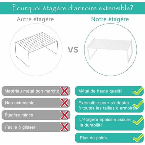 Vous cherchez une solution de rangement robuste et tendance ? L’étagère en métal est parfaite pour apporter une touche industrielle et moderne à votre intérieur. Idéale dans un salon, une cuisine, un bureau ou même un garage, elle s’adapte à tous les espaces et toutes les envies Si vous avez des questions ou des demandes, n'hésitez pas à nous contacter ! Organisateur Armoire Cuisine Cuisine Métal Étagère Rétractable Pour Placard Économise L'espace Pour Armoires De Comptoirs, Garde-manger, Aliments Et Ustensiles, 36-602118cm, Noir étagère Extensible Métal ✩ ➥ [SOLUTION DE STOCKAGE VERSATILE ] –Nos support de rangement de cuisine offrent une solution de stockage flexible pour répondre à tous vos besoins. Gagnez du temps et de l'énergie pour créer un grand espace de rangement dans votre cuisine ! La conception robuste garantit qu'elle ne se déformera pas et ne se pliera pas au fil du temps, offrant un support durable pour tous vos articles de cuisine. Que vous ayez de grandes casseroles, de petites épices ou une variété de gadgets de cuisine, cette étagère peut être ajustée pour accueillir des articles de différentes hauteurs et tailles afin de maximiser efficacement l'espace de votre cuisine Organisateur d'armoire - DILWE - Étagère rétractable - Métal Elles peuvent être utilisées partout dans votre maison, et conviennent aux comptoirs, aux bureaux, aux armoires de cuisine, aux armoires d'évier et plus encore. Il suffit de visser les vis et vous aurez vos étagères prêtes à l'emploi en quelques minutes. ✩ ➥ [ÉLÉGANT ET PRATIQUE ] –Nos rangement sous evier etagere ne sont pas seulement pratiques, elles ajoutent également une touche élégante à votre cuisine.