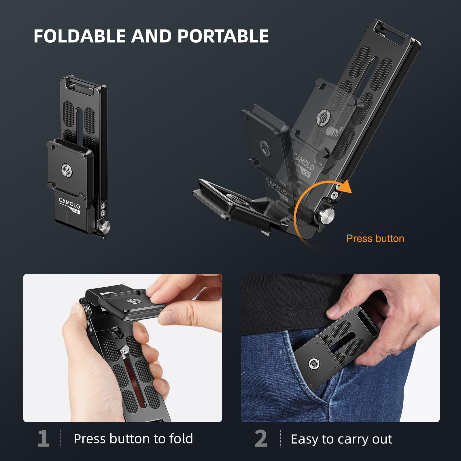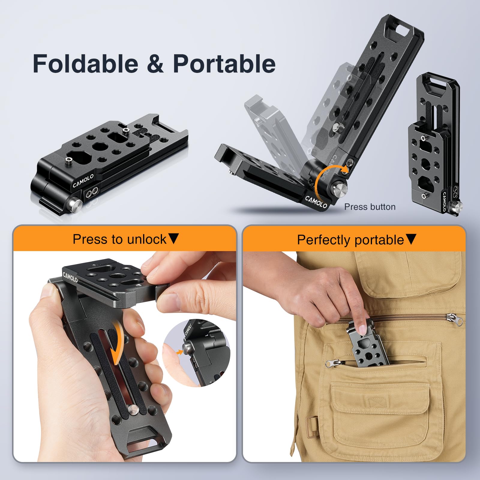 Support vertical et horizontal pour appareil photo : ce support en L peut être utilisé pour la prise de vue verticale et horizontale, peut rapidement passer de « paysage » à « portrait », au lieu d'utiliser une rotule, qui doit rester à niveau, peut également faire un excellent travail. Support réglable : ce support pliable en L pour appareil photo reflex numérique est universel et offre une orientation horizontale et verticale. Plateau à dégagement rapide : le plateau à dégagement rapide avec rail Arca-Swiss permet de changer de caméra rapidement et facilement Support vertical pliable pour appareil photo : le design pliable le rend compact et facile à transporter, ce qui en fait un accessoire parfait pour les photographes en déplacement. Cet appareil photo en L avec plaque à dégagement rapide Arca Swiss permet une transition fluide entre les orientations de prise de vue paysage et portrait. Il peut être utilisé sur une tête de trépied vidéo telle que stabilisateur de cardan Comme les caméras DJI Smooth, sans miroir après avoir installé une plaque d'adaptation; parfait pour les prises de vue en plein air telles que le streaming en direct Instagram IGTV ou toute prise de vue vidéo. Et 2 en 1 (trou de vis de 0,95 cm à 6,35 mm) au bas de la forme carrée Arca-swisss. Ainsi, lorsque vous l'utilisez sur une plate-forme hydraulique pour filmer des vidéos, vous n'avez plus besoin d'installer la plaque à dégagement rapide. Camolo Geek Support en L pliable vertical avec plaque de Très pratique à transporter et à ranger. Notre support de caméra en forme de L est composé de 2 plaques Arca-Swiss en aluminium fraisées séparément, la fonction de plaque pliante se verrouille lorsqu'elle est tirée et pour la replier vous appuyez sur le bouton déverrouillant la plaque et elle peut être repliée sur elle-même. Vous n'avez pas besoin de l'installer lorsque vous recevez et n'est plus aussi difficile à ranger que l'ancienne version. Système REAPER RAIL Arca Swiss pour montage sur trépied Support Pliable L Appareil Photo CAMOLO Support Pliable En L Pour Appareil Photo Reflex Numérique, Carré Arca Swiss Pour Tête Hydraulique, Trépied Vertical Horizontal, Plaque à Accessoire Photo Pour Tête Hydraulique Vidéo Design pliable : la plaque latérale pour Arca-Swiss est rapidement pliée sur le bas via un bouton pression pliable pour une prise de vue horizontale et l'écran LCD peut être ouvert en douceur sur le côté.