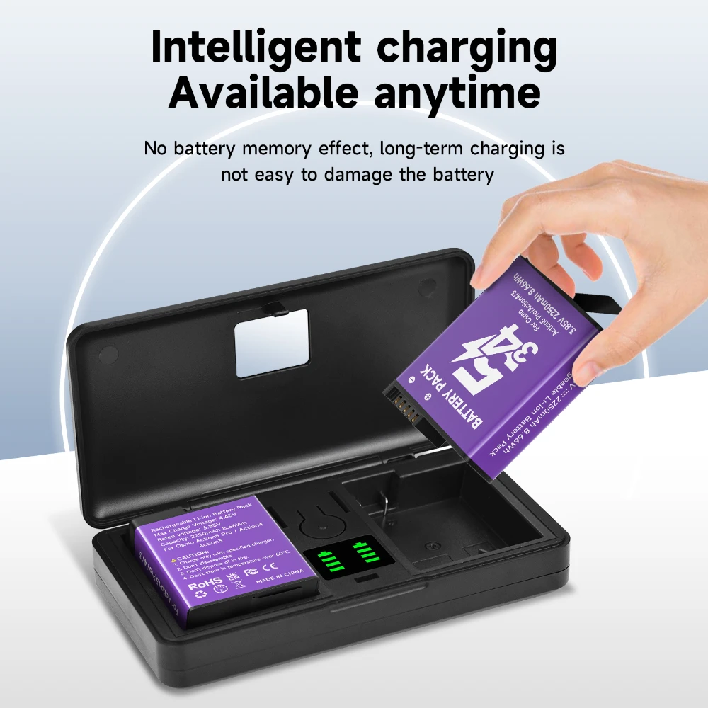 La carte mémoire peut être stockée, plus pratique. Chargeur de batterie pour DJI Osmo 360/ pour Action5 Pro, boîtier de charge avec cordon, kit de charge, chargeur rapide à 3 emplacements Spécifications : Nom du produit : Chargeur rapide portable Compatibilité : pour Osmo 360 Matériau : ABS Dimensions : 58,5 × 55,2 × 40,6 (mm ³) Poids : 67 g Liste des produits : 1 * Chargeur 1 * Câble de charge Trois batteries peuvent être rechargées en même temps pour une autonomie sans souci. Chargeur Portable ABS Pour Drone TELESIN Osmo 360/Osmo Action 5 Pro Chargeur De Batterie Pour DJI Osmo 360/DJI Action 5 Pro, Boîtier De Charge Rapide USB Avec Câble De Type C, Compatible Avec DJI, Triple Chargeur De Kit Recharge Batterie Avec Câble Découvrez le hub de chargeur de batterie pour DJI OSMO 360, pratique et efficace pour vos besoins de recharge avancés. Accessoires divers pour une expérience optimale Résumé du produit : Chargeur pour DJI Osmo Action5 Pro, Chargeur De Boîtier De Charge Rapide De Batterie Accessoires De Batterie Socle De Charge pour DJI Osmo Action5 Pro DJI dévoile l'Osmo 360 : une caméra 360° compacte, puissante et conçue