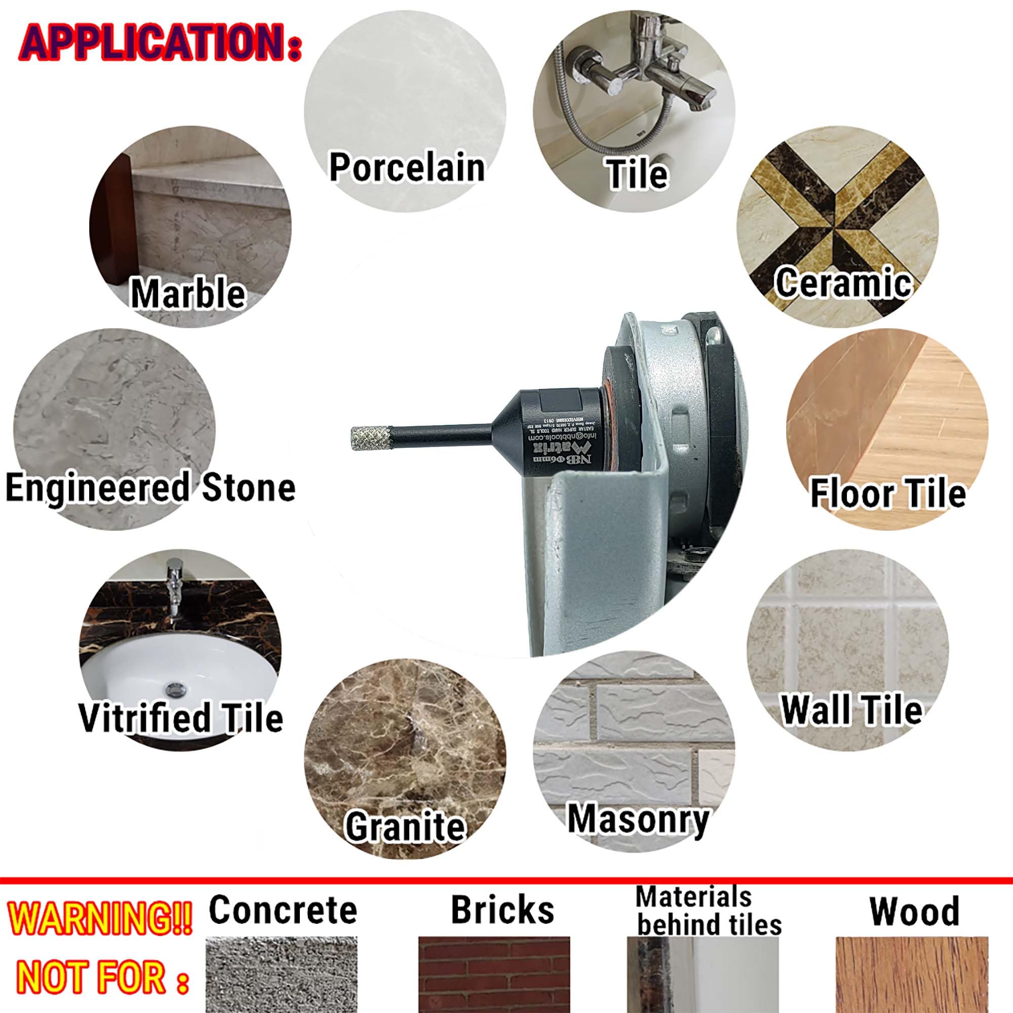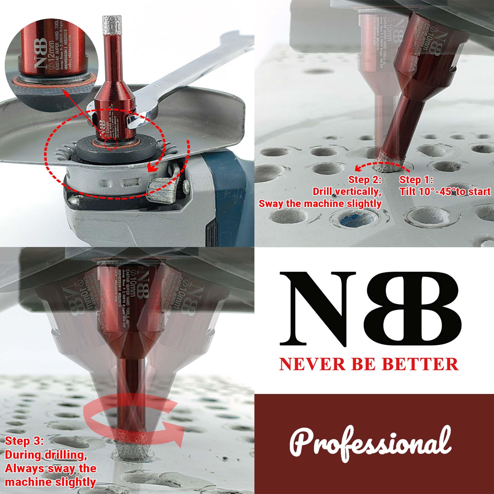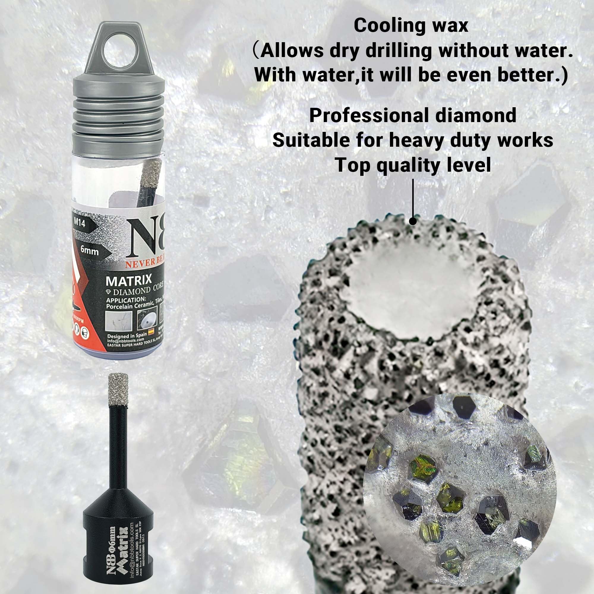 Longueur totale : environ 65 mm. La durée de vie moyenne des forets dépend toujours du type de matériau, de son épaisseur et du bon refroidissement et utilisation. 65 mm de longueur totale avec 45 mm de profondeur de perçage. Vous pouvez également faire le même excellent travail qu'un maître ! Les forets diamantés NBB VB peuvent être utilisés pour percer les trous nécessaires pour les entrées d'eau, les drains, les points d'éclairage, etc. HURRISE Foret de scie cloche diamant Fraise diamantée, 6 forets... Outils diamantés BRSCHNITT® Tous les produits Pour environ 18-130 mm. Vous pouvez percer beaucoup plus dans l'eau. Utilisez-le une fois, aimez-le à vie. Les outils parfaits sont à portée de main. NBB Forets Diamant Brasé Couronne Diamantée Avec M14 Pour Percer Le Forage A Sec Ou Humide De Maniere Sur Porcelaine Ceramique Carrelage Granit Marbre Carreaux Tuiles Meuleuse D Angle 1 20mm 1362144968 NBB forets diamant brasé sous vide avec M14, pour le forage à sec ou humide de manière professionnelle sur porcelaine,céramique,carrelage,granit, marbre, pour meuleuse d'angle (20/28/35/50/68mm clé Les forets diamantés NBB VB (diamètre 20-75 mm) ont une ouverture latérale qui améliore le refroidissement du foret et facilite l'élimination des déchets solides après chaque perçage. Les forets diamantés avec raccord fileté M14 peuvent être utilisés directement sur une meuleuse. 1 foret diamant de 6 mm de diamètre NBB VB de qualité professionnelle avec connexion M14, qui se connecte facilement à la meuleuse d'angle. Avec la technologie VB, le foret diamant peut percer à sec ou humide sur de la porcelaine dure et des pierres avec une efficacité accrue et une durée de vie plus longue. La profondeur de perçage peut être d'environ 45 mm. Efficacité de travail extrêmement élevée, une nouvelle génération de technologie diamant vous permet de percer des dizaines de secondes de grès dur, céramique, carrelage, granit, marbre., ., ., Durée de vie de perçage durable et stable, un foret NBB VB pour percer à sec des dizaines de trous en porcelaine dure, durée de vie beaucoup plus longue que celle galvanisée., Économisez votre argent.
