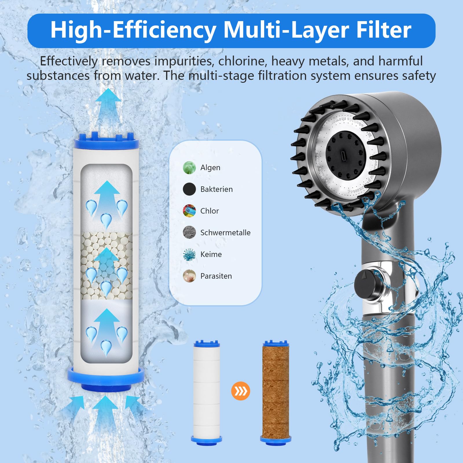 ★★★【Pomme de douche haute pression】Ce pommeau de douche à main est doté d'une microtechnologie et d'une structure unique pour une pression accrue. Durable, élégant et compact, il est idéal pour les petits espaces. Caractéristiques : ✅ Pommeaux de douche haute pression avec 4 modes de jet ✅ Pommeau de douche à main + jet hydromassant combiné ✅ Réglage de rinçage adapté aux animaux + jet massant en silicone ✅ Pommeau de douche filtrant avec douchette facile à installer sans outil Avantages : - Jet hydromassant haute pression pour eau dure. ★★★【Fonction de réglage de la pression】Le contrôle de la pression de la douche permet une expérience de douche personnalisée, adaptée à vos besoins et préférences. Profitez du confort de donner le bain à votre enfant ou à votre animal de compagnie assis, sans avoir à vous lever constamment pour régler le débit d'eau. Poeau de Douche Econoie Deau - Wappiot - Poeau de Douche Haute... Ce pommeau adoucit l'eau dure et protège contre les dommages cutanés et capillaires grâce à un système de filtration à 18 couches qui élimine diverses impuretés. L'arrêt d'eau instantané permet un arrêt rapide en cas d'urgence, pour une sécurité accrue. - Le pommeau de douche à gouttes ioniques associe un jet hydro haute pression à un système de filtration pour neutraliser l'eau dure, le chlore et les impuretés. ★★★【Arrêt d'eau instantané】Fini les manipulations fastidieuses de l'interrupteur du chauffe-eau ni les difficultés à le retrouver pendant le shampoing. Pommeau Douche Avec Tuyau Support Pommeau Douche Haute Pression Idéal pour moderniser votre pommeau de douche, ce pommeau de douche filtrant avec douchette s'installe sans outil. Idéal pour les pommeaux de douche avec filtre pour eau dure. Il répond à tous vos besoins sans nécessiter de réglages complexes, pour une utilisation simplifiée. Améliorez votre rinçage quotidien avec notre pommeau de douche combiné haute pression, conçu pour les appartements, les locations et les étudiants. Pommeau économique Eau 4 Modes Jet économie Eau Douche Pommeau De Douche Haute Pression Anti-Calcaire - 3 Jets, Filtre Eau, Tuyau 1.5m économie Eau 3 Jets Pommeau Avec Tuyau 1.5m Support Mural Quelle que soit la pression de l'eau locale, le pommeau de douche à réglage complet de la pression garantit une expérience constante. ★★★【Pomme de douche filtrée améliorée】Élimine 99,99 % du chlore pour réduire la sécheresse et l'irritation de la peau et des cheveux.