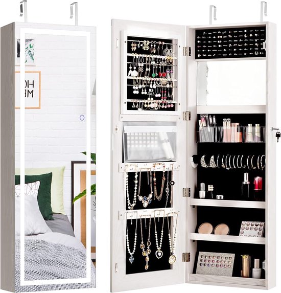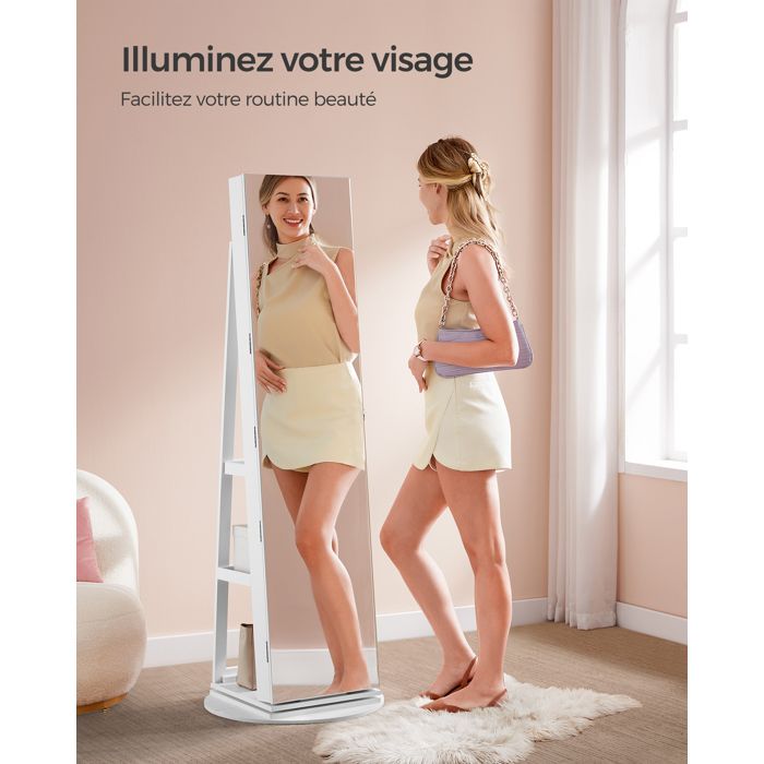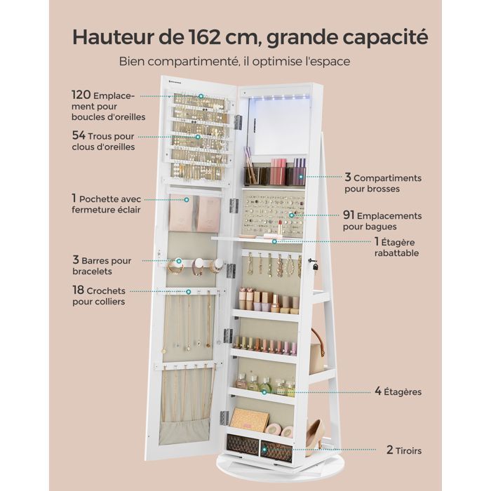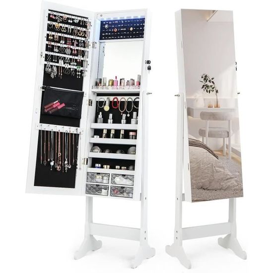Vous pouvez déplacer l'armoire comme vous le souhaitez et ne se renversera pas facilement. La porte du miroir peut être verrouillée avec une clé, de sorte que vos précieux bijoux sont bien protégés Structure simple, facile à assembler. Un système à bascule permet d’ajuster parfaitement le miroir pour une meilleure visibilité. Ces meubles peuvent accueillir jusqu’à une centaine de bijoux, ainsi que plusieurs accessoires de petite taille Grâce à son excellente finition, il peut être combiné avec différents styles décoratifs et ajouter beaucoup d'élégance à votre pièce Dimensions (L x l x H) : 41,5 x 37 x 160 cm. Beaucoup d'espace de rangement, bien rangé Miroir rabattable sur toute la longueur, pratique Design verrouillable, pour plus de sécurité. Design multifonction : cette armoire à miroir 4 en 1 combine un miroir complet, une armoire à bijoux, une coiffeuse et une étagère en un. Que vous souhaitiez vous habiller, ranger vos bijoux ou exposer vos articles de décoration, cette armoire à miroir est la solution parfaite pour vous Pour mieux protéger vos bijoux et autres objets, notre armoire à bijoux est rembourrée de velours à l'intérieur et peut être verrouillée. Surface laquée, lisse sans stries. Angle réglable : l'armoire avec miroir rotatif est réglable sur 4 angles, de sorte que vous pouvez tourner l'armoire pour trouver la meilleure position., Ne se renverse pas. Grand espace de rangement : 5 compartiments doublés pour boucles d'oreilles, 4 rangées de fentes pour bagues, 29 crochets pour colliers et bracelets, 6 compartiments de rangement et 2 tiroirs inférieurs pour cosmétiques et accessoires offrent beaucoup d'espace de rangement pour vos bijoux, les bijoux sont rangés proprement Miroir de corps entier : ce meuble à bijoux est livré avec un miroir sur toute la longueur, ce qui facilite l'habillage. Avec poignée cachée, facile à ouvrir. Ainsi, vous pouvez facilement trouver les bijoux dont vous avez besoin. Armoire à bijoux murale avec miroir et effet bois blanc Lina | Maisons du Monde Avantages : Matériaux de haute qualité, résistants et durables. Description du produit : Vous avez du mal à trouver vos bijoux ? Notre armoire à bijoux peut tout améliorer. Pratique pour sélectionner des bijoux et s'habiller. 1 mode d'emploi (français non garanti). Armoire à Bijoux Avec Miroir HOMASIS Armoire à Bijoux Miroir Mural, Armoire à Bijoux Avec LED Automatique, Avec Miroir à Chiffres Entiers, Miroir à Bijoux, Armoire à Bijoux à Suspendre à Porte, Blanc Armoire Bijoux Miroir Sur Pied Caractéristiques techniques : Couleur : blanc/marron., Matériau : MDF. Notre armoire à bijoux est si esthétique que vous pouvez la placer dans n'importe quelle pièce. Avec 14 lumières LED : il y a 14 lumières LED à l'intérieur de la boîte à bijoux.