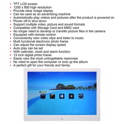 Spécification :Type d'article : Cadre photo numériqueMatériel : ABSCouleur : NoirRésolution : 1280 x 800Prise : 110-240VPile de la télécommande : pile bouton CR2025 (non incluse)Écran : écran numérique LED 13 pouces (16:10) Format d'image pris en charge : JPEG, l'image peut être agrandie et TournéPrend en charge les formats vidéo : MP4, AVI, MPG, FLV, VOB (formats vidéo tout compris)Prend en charge le format audio : MP3, WMA (sortie audio stéréo)Prend en charge les supports de stockage : carte de stockage , MMC, carte MS, disque USystème vidéo : prend en charge NTSC, commutateur PALInterface de sortie : interface de sortie casqueMode de contrôle : manuel, télécommande ou mise sous tension, lecture automatique des images, des images et publicités musicales et vidéo ; prise en charge de la lecture mixte en optionMode d'emploi :Retirez le produit et utilisez-le conformément au manuel. Cadre Photo Numérique 13,3’’ Gaming 1080p Bordures Slim Liste des colis :1 x cadre photo numérique1 x support1 x adaptateur1 x télécommande (batterie non incluse) Vous pouvez également définir différents effets de diaporama, la vitesse du diaporama, le mode de répétition, la lecture du point d'arrêt (uniquement pour la lecture vidéo). Les haut-parleurs stéréo intégrés garantissent que le son joué est suffisamment clair. Cadeau Pour Famille Album Photo électronique, Cadre Photo Numérique à écran LED 15,4 Pouces 1024x768 Haute Résolution Avec Télécommande Pour La Maison Pour La Publicité (Prise UE Cadres Photo Numérique Prend en charge le format d'image JPEG, peut être agrandi, pivoté. AFFICHAGE HD : cadre photo numérique avec écran de 13 pouces avec une résolution de 1280 x 800 et un rapport d'aspect de 16:10., Avec le mode veille personnalisé et les paramètres de rotation automatique pour une meilleure expérience visuelle. MUSIQUE STÉRÉO : Avec le cadre photo numérique intelligent, vous pouvez enregistrer vos chansons préférées comme musique de fond pour vos photos préférées. Vous pouvez redimensionner les photos dans les paramètres pour éviter la distorsion, et le grand angle de vue vous permet de voir les photos sous tous les angles. Cadre Photo Numérique 13 Pouces Vous pouvez également profiter d'une musique de fond. Ce cadre photo numérique électronique Plug and Play, pas d'opération réseau compliquée nécessaire, les personnes âgées peuvent également l'utiliser. Écran IPS de 13 pouces, qui est plus grand que l'écran de 10,1 pouces et peut afficher des photos et des vidéos HD