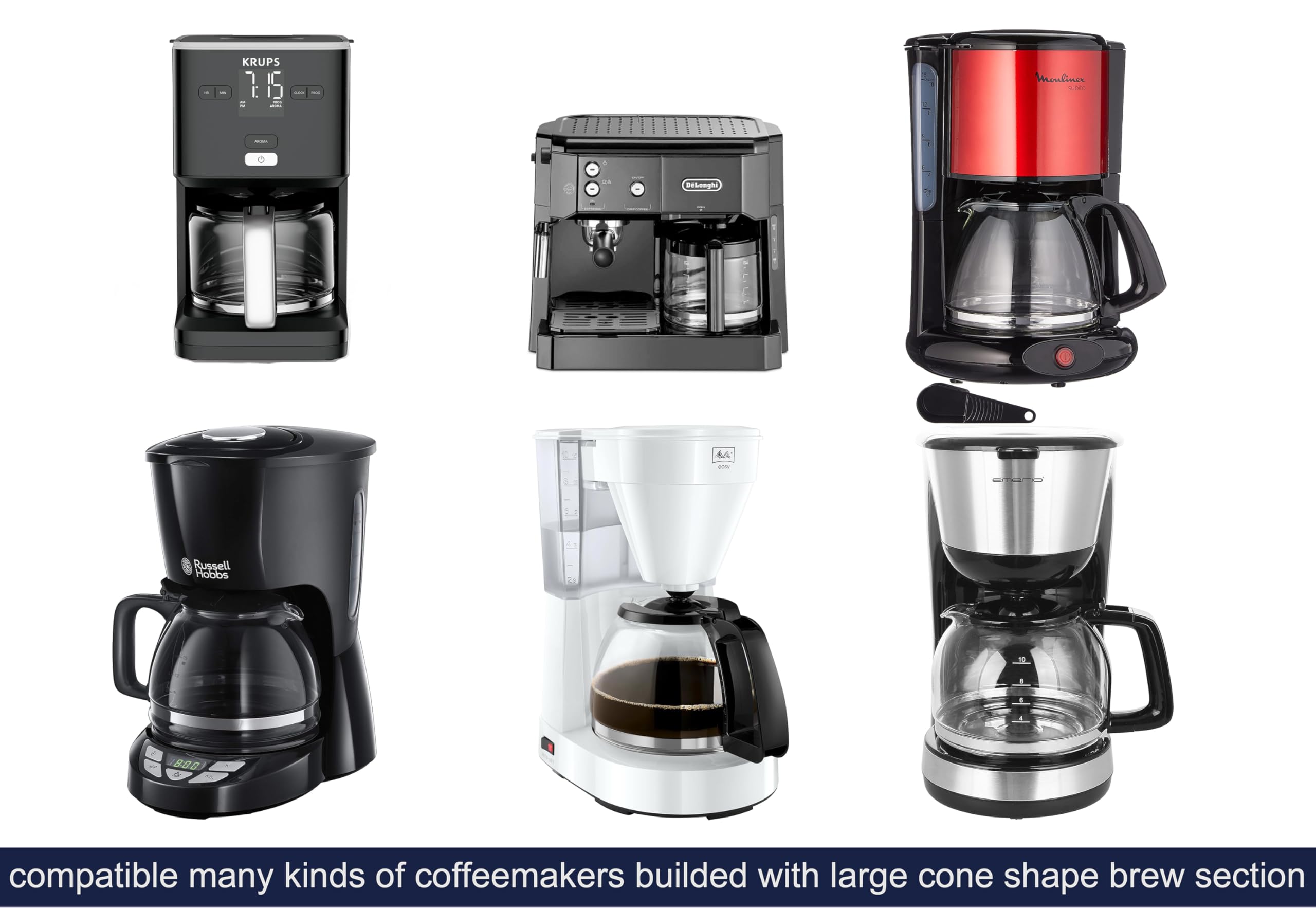 Filtre à café réutilisable 10 à 12 tasses en forme de cône avec poignée en maille dorée Caractéristiques : PP de qualité alimentaire. Le filtre de la machine à café est compatible avec la machine à café, la bouilloire, le purificateur, le filtre à air, le déshumidificateur et le collecteur de poussière, adapté à la filtration de divers liquides Treillis métallique en acier inoxydable doré 304., Diamètre : 118 mm. et stable, installation facile, longue durée de vie. Processus de filtration directe simple, bonne perméabilité, uniforme et stable, installation facile, longue durée de vie Filtre Permanent Café GoldTone Filtre à Café Réutilisable De La Marque 8-12 Tasses Pour Filtre Café Cône Réutilisable 10-12 Tasses Inox 304 Doré Longueur de la base : 55 mm. Contenu de l'emballage : 1 filtre conique pour cafetière Filtre à café en forme de cône permanent 10-12 tasses Largeur du fond : 15 mm., Hauteur : 85 mm. YOSOO tasse de capsule Filtre à café en acier inoxydable pour capsule Processus de filtration directe simple, bonne perméabilité, uniforme. LOOK-Zerone filtre de capsule de café Filtre à capsule de café...