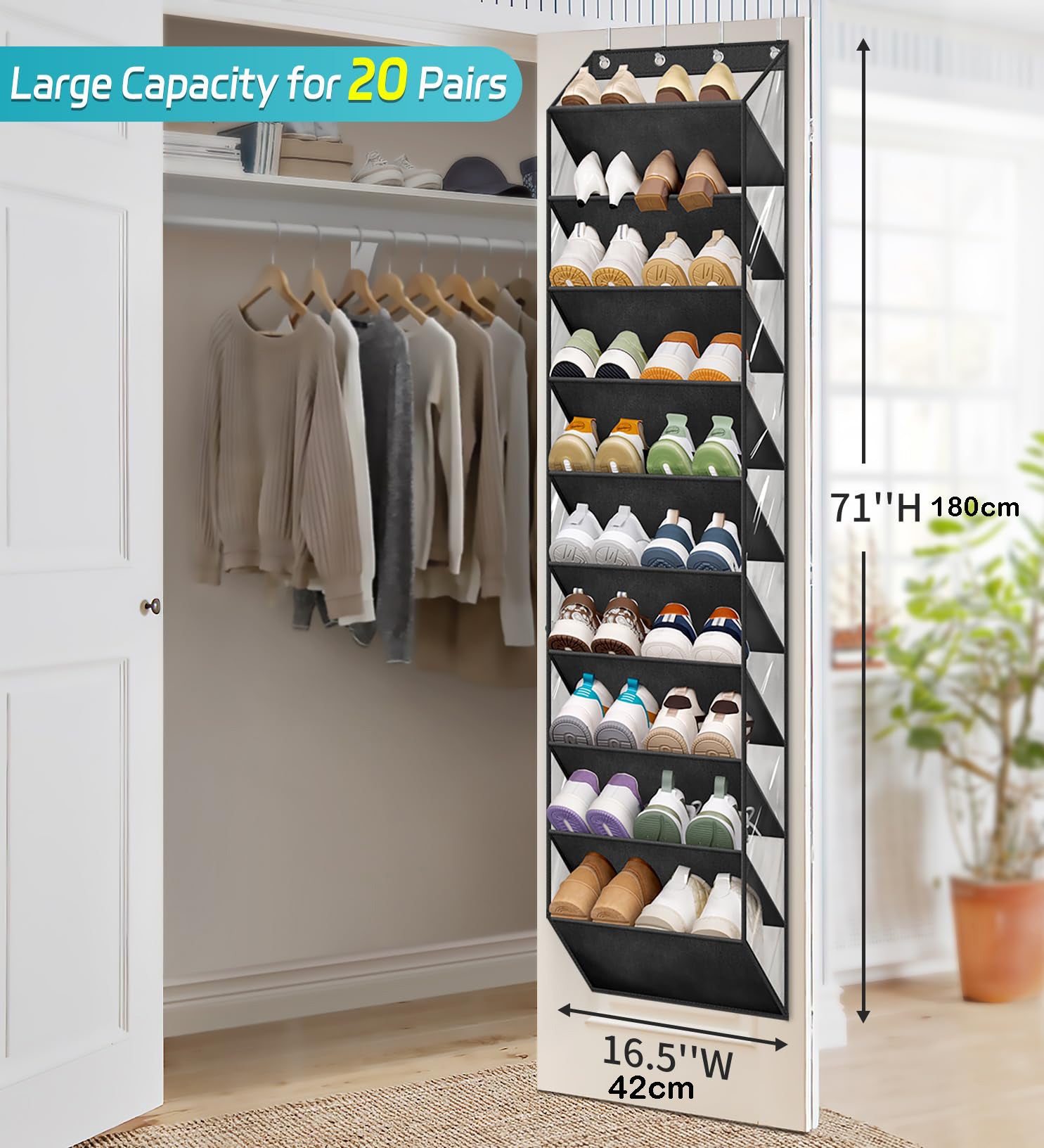 Non seulement idéale pour tous les types de chaussures, mais aussi parfaite pour les articles de toilette, les collations, les cosmétiques, les écharpes, les gants, les chaussettes, les chapeaux, les jouets et bien plus encore. Nos supports à chaussures sur porte répondent à vos besoins. Le tissu robuste résiste à l'utilisation et est facile à nettoyer, de sorte que votre maison reste bien rangée à tout moment. Contenu de la livraison : 1 organiseur de chaussures à suspendre au-dessus de la porte. Design de crochets non amovibles : Les petits objets tels que des sacs, des clés, des cravates, des chapeaux, des écharpes, des casques, des tapis de bébé, des peignoirs, des sweats à capuche, etc. Il y a 6 jours · Un grand choix de produits aux meilleurs prix RANJIMA Support à Chaussures Réglables, 4 Pièces Rangement Chaussures Organisateur de chaussures au-dessus de la porte avec une grande capacité : l'organisateur de chaussures au-dessus de la porte mesure 81 x 43 cm et dispose de 12 compartiments généreux. Le design peu encombrant permet une organisation efficace. Utilisation polyvalente : en plus du rangement des chaussures, l'organisateur de chaussures peut également être utilisé pour les accessoires, les matériaux de bricolage, les jouets, les ustensiles de cuisine, les produits de toilette, les produits de toilette, les produits de beauté et d'autres articles ménagers. - Dimensions : 43 x 17 x 81 cm. Sollbry 2 Pièces Range Chaussures à Suspendre Sur La Porte, Sac De Rangement Suspendu Avec 24 Poches Rangement De Chaussures Suspendu Organiseur De Suspension Multifonction Pour Chambre A Coucher 85459853 Rangement à chaussures à suspendre sur porte, étagère à chaussures avec 8 poches profondes, organiseur de chaussures avec 4 crochets métalliques robustes, 20 paires de chaussures (noir Le tube en fibre conserve sa forme : Le tuyau en fibre intégré a une capacité de charge élevée et conserve sa forme à long terme, ce qui évite les déformations. L'organisateur de chaussures de porte est non seulement adapté à tous les types de chaussures, mais aussi idéal pour une variété d'objets tels que les ustensiles de toilette, les articles de garde-manger, les cosmétiques, les serviettes, les gants, les bouteilles, les clés, les chapeaux, les jouets et plus encore. - Couleur : gris/noir. L'étagère à chaussures suspendue RANJIMA répond parfaitement à vos besoins. Matériau de qualité supérieure : Fabriquée en tissu Oxford 600D robuste et durable, super léger et résistant à l'usure, plus durable que le tissu non tissé. Utilisation multiple dans différents scénarios : notre rangement à chaussures suspendu peut être utilisé pour ranger une variété d'objets et est idéal pour les armoires, les buanderies, les salles de jeux, les chambres, les salles de bains et même les portes arrière de camping-car.