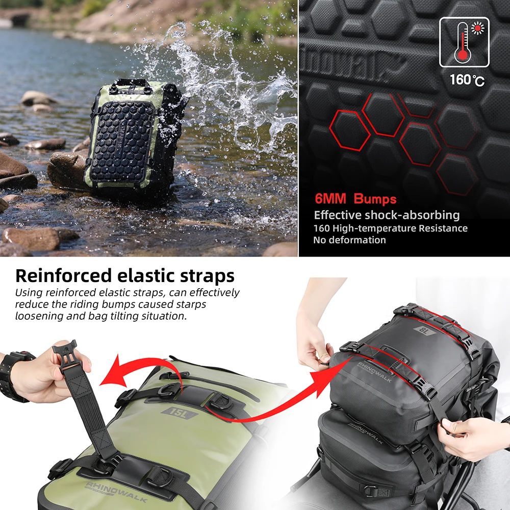 Le sac de moto Rhinowalk est le compagnon idéal pour les aventures sur deux roues. Grâce à la poche intérieure amovible et étanche, vos affaires restent au sec par tous les temps Pas de glissement, pas de traction, même sur des terrains accidentés. Sacoche Cavaliere Moto Sac Moto Etanche Rhinowalk Sac De Selle De Moto étanche Et Extensible Pour Sacoche Crash Bar Moto Sacoche Selle Moto étanche Le sac de moto Rhinowalk est le compagnon idéal pour les aventures sur deux roues. Construction robuste : les plaques en polyéthylène renforcées sur trois côtés assurent la stabilité dimensionnelle et une protection fiable du contenu, même en cas de trajets cahoteux. Portable et pratique : avec la bandoulière fournie, le sac peut être porté confortablement comme sac à bandoulière ou sac à bandoulière, idéal pour les déplacements ou les voyages. Type : sacoche de selle de moto 45 l. Principales fonctions et caractéristiques : 1- Étanche : technologie de tension sans couture matériau entièrement étanche, étanchéité et imperméable à l'eau contre la pluie. 2- Peut être utilisé comme sac de moto/sac à main/sac à bandoulière. Design modulaire, sangle à boucle universelle, 20 L 45 L 65 L peuvent être utilisés en... Rhinowalk 45L Sissy Bar Sacoche Moto Rhinowalk 45L - Étanche Fixation stable avec boucles de serrage : quatre sangles avec boucles de serrage assurent un maintien ferme sur les étriers de chute ou d'autres pièces de moto. Possibilités de montage polyvalentes : 1., Fixation au pare-choc (convient à tous les modèles ADV)., 2., Montage sur porte-bagages., 3., Peut être utilisée comme sacoche de réservoir ou de poche latérale en combinaison avec RhinoWalk MT001A/MT002A., 4., Extension des sacoches de selle existantes (par exemple B., Rhinowalk MJX2004). Grâce à la poche intérieure amovible et étanche, vos affaires restent au sec par tous les temps.
