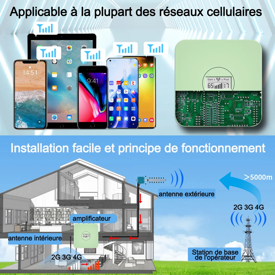 Aucun perçage nécessaire, utilisation d'un câble de fenêtre plat pour connecter le booster à l'antenne externe. aplus-module-wrapper { margin-left: auto; margin-right: auto;}Fréquences prises en charge en Italie 900 (E-GSM) GSM 1800 (DCS)GSMB1 (2100) UMTS ---B8 (900 GSM) UMTSB3 (1800 +) LTE -----B7 (2600) LTE ----------------B20 (800 DD) LTERecevez automatiquement les signaux des tours de signalisation dans toutes les directions à proximité Rayonnement sûr et faible. Amplificateur 5G, 4G, 3G - 6 bandes 65dB / IP40 | jusqu’à 1500m² Amplificateur 4G/3G GSM LTE avec Antenne Intégrée - Compatible Bandes 1/3/7/8/20 - Boosteur De Signal Mobile pour Maison/Bureau - Gain Réglable 70 DB - Contrôle Double par APP Et Écran L'antenne intérieure peut être placée sur une étagère ou montée au mur. Solution Zones Faible Réception Amplificateur De Signal Mobile 5 Bandes 2G/ 3G/4G/5G - 70dB Gain - Compatible Free, Orange, SFR, Bouygues - Pour Maison/Bureau Répéteur Téléphone Avec son support spécialement conçu, l'antenne externe peut être rapidement pointée vers les antenne-relais proches pour une plus grande puissance du signal Avec un gain maximum de 65 dB, l'amplificateur de signal répond à toutes les directives CE et n'arrêtera pas ou n'endommagera pas les signaux des vecteurs depuis et vers l?antenne-relais Avec 21 dBm de puissance de sortie en liaison montante et 12 dBm de puissance de sortie en liaison descendante, ce répéteur domestique atteint facilement les antenne-relais de téléphones mobiles à partir d?une longue distance Brouilleur Telephone Portable 4g 5g Aplificateur De Signal 5 Bande 800, 900, 1800, 2100, 2600 Hz Booster Signal Mobile Maison Coupe-chaîne de 15 mètres, antenne externe, antenne interne, 5 bandes, amplificateur de signal Description du produit. aplus-3p-fixed-width { width: 970px;}., aplus-v2 ., aplus-3p-fixed-width.