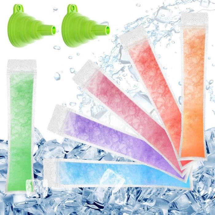 Faites de la glace :1., Fruits, jus et lait : préparez des fruits frais, du lait, du jus ou tout ce que vous voulez essayer et coupez les ingrédients en petits morceaux. Glace A L Eau Maison SunAurora 100PCS Pochettes Popsicle Moule Sacs, Ice Pop Pouch, Sacs De Bonbons Glacés Diy Mettez tous les ingrédients dans un seul récipient., 2., Mélangez tous les ingrédients uniformément ou utilisez un presse-agrumes pour vous aider., 3., Remplissage (pas plus que la ligne complète) : ajoutez les mélanges dans les moules à glace avec un entonnoir, un sac ou une tasse décorative. Oubliez les congélateurs salissants et les sacs à dos collants. Les possibilités sont infinies! 200 Pcs Sachet Glace à L'eau, Pop Bags Pop oule Sacs Popsicle... Contenu de la livraison :100 x Sac à Sucettes Glacées1 x entonnoir en siliconeRemarque :Ne congelez pas trop plein, assurez-vous de laisser environ 15 mm d'espace en haut. Détachez simplement l'encoche et mangez-la, sans avoir à ouvrir laborieusement la fermeture éclair du joint. Utilisations multiples: Ces sachets à glaçons conviennent aux glaçons sains faits maison ou aux bonbons glacés. Une fois le sac rempli et scellé, il est recommandé de placer l'ouverture vers le haut pour éviter les fuites. ce qui est facile à transporter. Le jus peut être facilement emballé dans un sac de glace, qui est un outil de crème glacée bon marché et idéal pour les bâtonnets. Moule À Sucettes Glacées - Plateau À Popsicle À Dégagement Facile 8