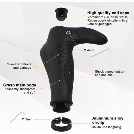 Cuir PU Antidérapant Guidons Vélo Confort LYCAON Poignées De Guidon Vélo Antidérapantes - Avec Serrure Aluminium Pour VTT, BMX, Scooter Poignée Velo Poignées VTT City Bike Scooters Avec ces poignées, vous ferez l'expérience d'une conduite sans effort et confortable à chaque fois. Offre une expérience de conduite sans fatigue, même sur de longs sentiers ou des routes de montagne accidentées. Nous garantissons une solution rapide et satisfaisante à vos préoccupations, avant et après votre achat. Durable et léger - Chaque poignée ne pèse que 113 g, alliant durabilité et légèreté. Avec un excellent service avant et après-vente - veuillez nous contacter pour toute question ou préoccupation. Compatibles avec une variété de vélos, elles s'adaptent aux guidons d'un diamètre compris entre 20 et 22 mm. Parfait pour les trajets courts à moyens. LYCAON se consacre à la recherche de produits et d'accessoires de vélo depuis plus de 20 ans. Guidons Vélo Confort LYCAON Poignées De Guidon Vélo Antidérapantes Conception ergonomique pour un confort maximal Nos poignées de vélo sont conçues pour s'adapter parfaitement à vos mains, que vous portiez des gants ou non. Poignées de Cycle Deemount 137/93mm guidon serrure... – Grandado Que vous soyez un cycliste professionnel ou amateur, ces poignées dépasseront vos attentes et rendront chaque trajet plus agréable. La conception ergonomique offre un soutien optimal et prévient la fatigue, même lors de longues randonnées ou de sentiers de montagne accidentés. Antidérapant et cuir souple - Le matériau principal de la poignée de vélo est du cuir PU souple, qui est confortable. Si vous avez des questions ou des préoccupations, notre sympathique équipe du service client est toujours disponible pour vous aider. La surface de contact accrue répartit la pression de manière uniforme, ce qui permet une utilisation à long terme sans gêne. Choisissez la qualité, le confort et le style avec nos poignées de vélo ! Nos embouts de guidon sont construits en caoutchouc, éponge et aluminium, il se compose de trois parties : tête, bas, vis. Laissez plus d'espace pour remplir le trou du guidon et la vis peut les rendre plus solides Le matériau souple absorbe efficacement les chocs, tandis que le rembourrage intégré de la paume offre une réduction supplémentaire des vibrations. Design ergonomique - S'adapte parfaitement à vos mains dans toutes les conditions, avec ou sans gants.