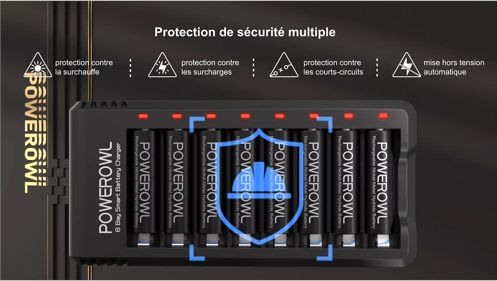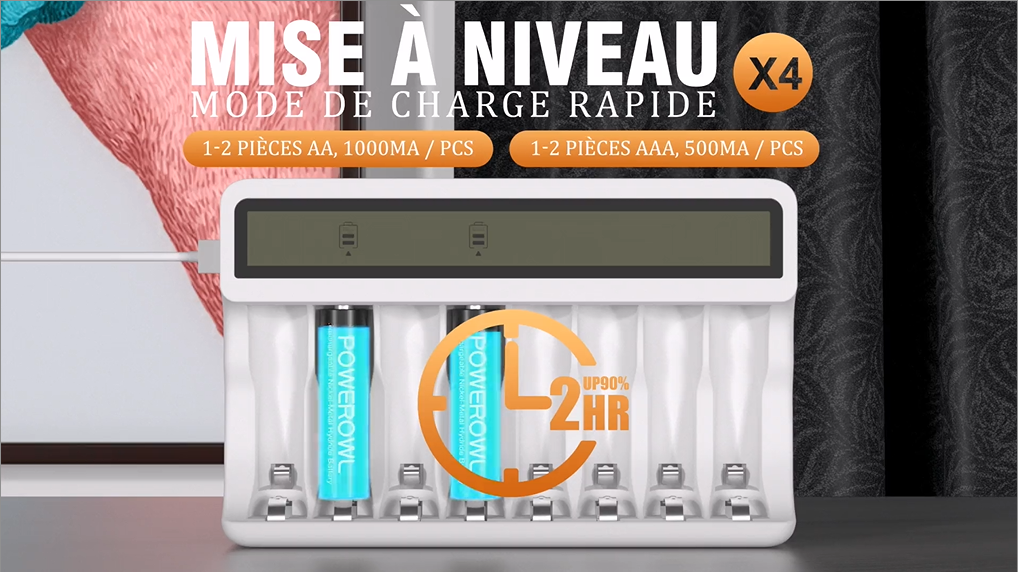 La fonction de charge intelligente sur les chargeurs vérifie les conditions de charge des batteries, les températures des batteries et du chargeur, etc. Les batteries atteindront une performance maximale après 3 à 5 cycles de charge complète Powerowl Chargeur de batterie universel pour piles rechargeables AA, AAA, C, D Compatible avec : Batterie NiMH/NiCD rechargeable : AA, AAA, C, D Batteries rechargeables Li-ion 3,7 V Rechargeable AA Batteries with Charger, 8 Pack of 2800mAh High Capacity Low Self Discharge Ni-MH Double A Batteries with Smart 8 Bay Battery Charger (USB Fast Charging, Independent Slot Les piles AA/AAA rechargeables sont pré-chargées et prêtes à l'emploi Lorsque vous chargez deux cellules inégales par paire, celle avec une capacité inférieure finit par être surchargée, ce qui réduit encore sa capacité au fil du temps. 1 chargeur de batterie universel Powerowl Technologie brevetée Powerowl, seule la version 2021 du chargeur a cette fonction. En effet, même si vous démarrez avec la même marque de batteries de recharge, il y a toujours une certaine différence dans leurs capacités. Les 7 eilleurs Chargeurs Piles Rechargeables (juin 2024) - Lebonpanier Powerowl charge n'importe quel nombre de piles rechargeables AA AAA C D pour faciliter votre chargement et prolonger la durée de vie de la batterie Le chargement par paire est mauvais pour la durée de vie de la batterie à long terme. Avec l'interface d'entrée Micro USB et Type C, améliore l'adaptabilité de votre chargeur, vous pouvez utiliser un ordinateur portable, un chargeur de voiture, un chargeur de téléphone portable, etc. Chargeur de piles: Chargeur USB de POWEROWL compatible avec tous les types d’accus AA et AAA (pas de charge de piles alcalines ou au lithium). Utilisez l’adaptateur 5 V/2A pour charge, 1000 mAh AAA batteries besoin 3,33 heures pour obtenir une charge complète 1 câble USB micro (sans adaptateur) Caractéristiques du chargeur : Entrée : DC 5 V 2 A Sortie : DC 4,2 V : 1000 mA x 2 ; 2000 mA/(3-4) 3,7 V Li-ion DC 1,4 V : 1000 mA x 2 ; 2000 mA/(3-8) NiMH/NiCD 8 voyants lumineux de charge Vert : Entièrement chargé , Rouge : Chargement Le chargeur Powerowl peut rapidement détecter les batteries endommagées. Bay Smart Battery POWEROWL Piles AA Rechargeables 2800mAh Avec Chargeur De Batterie Pile Aaa Les batteries Powerowl offrent des performances exceptionnelles à des températures extrêmement basses, jusqu'à -4 degrés pour charger la batterie Nous avons une technologie de production de batterie de base, des milliers de techniciens qualifiés et de nombreux équipements de production avancés pour garantir que nous pouvons produire des produits de haute qualité., 8 piles rechargeables AA Les piles rechargeables AA fonctionnent bien avec une variété d'appareils électroniques qui peuvent être utilisés sous 1,5 V, y compris les appareils haute puissance tels que les appareils photo numériques, les brosses à dents électriques et les lampes de poche.