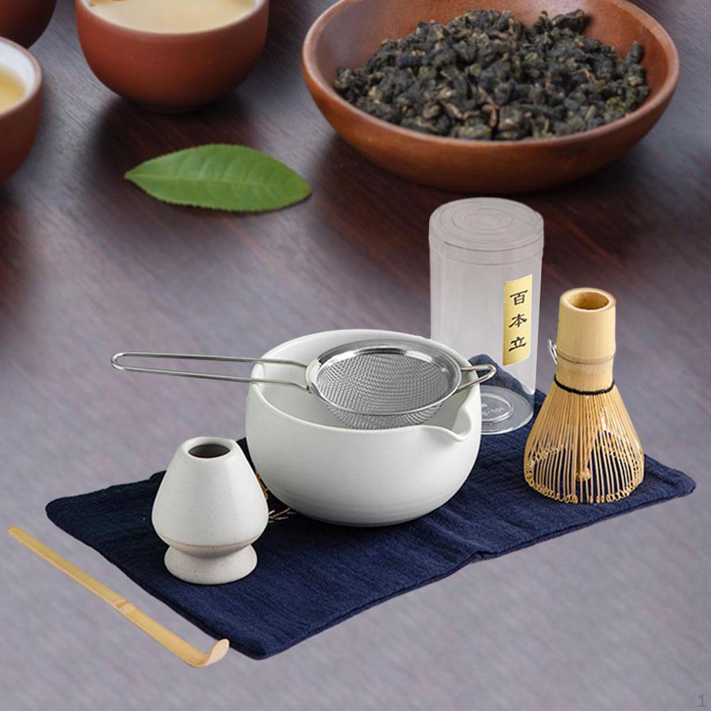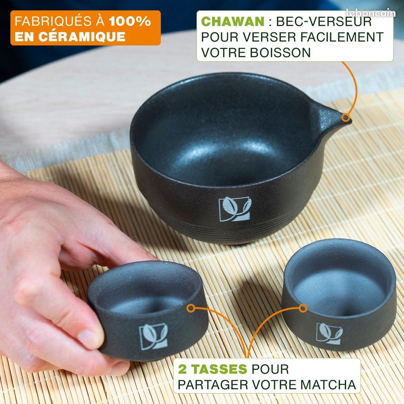 Amoseeds Kit Matcha | Complet, 9 accessoires | Bol, Tasses, Tamis, Fouet en bambou, Support fouet, Cuillère, Support cuillère, Serviette | Coffret cadeau, tradition Japonaise | Qualité Supérieure - Arts de la table Enfin, la serviette à thé, fabriquée à partir de coton et de lin, complète parfaitement notre coffret en offrant un support pratique pour vos accessoires. Un kit matcha est une invitation à découvrir l’essence même de l’harmonie japonaise. Chaque élément de nos kits a été soigneusement sélectionné pour vous offrir une expérience authentique et inoubliable Kit Cadeau Matcha du Japon Premium 100% BIO ou Naturel - Fouet en bambou, bol à matcha, porte-fouet naoshi. Prix réduit -15%. - Livraison garantie - Idéal et Complet avec tous les accessoires ✅ 1 CHASEN DE 120 TIGES EN BAMBOU : notre chasen est fabriqué à partir d’un morceau de bambou selon la tradition japonaise. ✅ CADEAU UNIQUE QUI ALLIE TRADITION ET ÉLÉGANCE : nous avons pensé notre Set d’accessoires à Thé Matcha comme un coffret d’exception qui allie tradition, praticité et authenticité. Fouet Matcha Matcha Kit 4 Piu00e8ces Matcha Set, Kit Matcha, Comprend Le En Bambou, Cuillu00e8re Traditionnelle, Cuillu00e8re U00e0 Thu00e9, Support , L'ensemble Parfait Pour Pru00e9parer, Vert Maille The Matcha Le tamis vous permettra d’affiner la texture du matcha afin d’obtenir une boisson homogène. Conçu avec des matériaux nobles comme la céramique, le bambou, l’acier inoxydable, le coton et le lin, il contient tout le nécessaire pour préparer et déguster un matcha authentique : chawan, tasses, chasen, chashaku, tamis et plus encore. ✅ 1 CHAWAN + 2 TASSES + 1 PORTE-CHASEN EN CÉRAMIQUE : notre Chawan (bol avec un bec verseur), nos petites tasses et notre porte-chasen sont fabriqués en céramique de haute qualité, le matériau traditionnel. Avec son toucher légèrement rugueux, elle offre une expérience sensorielle unique, loin de la froideur des finitions industrielles modernes. La céramique permet de conserver la chaleur de l’eau sans la rendre brûlante et respecte la pureté du matcha en n’altérant jamais son goût. Le chashaku en bois permet de doser avec précision votre thé matcha. Véritable indispensable dans la préparation du matcha, notre chasen permet de libérer toutes les saveurs subtiles de ce thé vert d’exception, tout en créant une mousse aérienne, onctueuse et homogène. Il contient un chawan en céramique d’une contenance de 500 mL, deux tasses assorties de 70 mL chacune, un porte-chasen en céramique également, un chasen en bambou de 120 tiges, un chashaku en bambou avec un porte-chashaku, une serviette à thé en coton et lin naturel de 40 x 40 cm ainsi qu’un tamis en acier inoxydable.