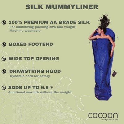 Tissée avec une structure de fils de soie solide, la soie Ripstop est plus durable et résistante à la déchirure que la soie ordinaire. La soie est douce contre votre peau et répond bien aux changements de température - elle est fraîche en été et chaude en hiver. Ajoute jusqu'à 12,5 °C à un sac de couchage Double couture pour une durabilité exceptionnelle, assurant que votre doublure de sac de couchage résiste aux rigueurs des aventures en plein air pour les années à venir. Équipé d'une capuche avec cordon de serrage pour sceller efficacement les éléments, offrant une protection et une chaleur supplémentaires pendant les nuits froides en plein air. Soie Ripstop Lavable Machine Cocoon Mummyliner - Sac à Draps - Soie - Marron Cocoon Sleeping Bag Liner Our high quality silk is the optimal fabric to minimize size and weight. Silk is soft against your skin and responds well to temperature changes - it is cool in summer and warm in winter. Silk mummy liners are easy to wash by hand or machine and dry quickly Cocoon MummyLiner Silkki, Mummy Sleeping Bag Liners Română