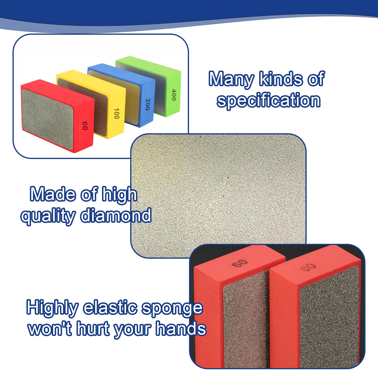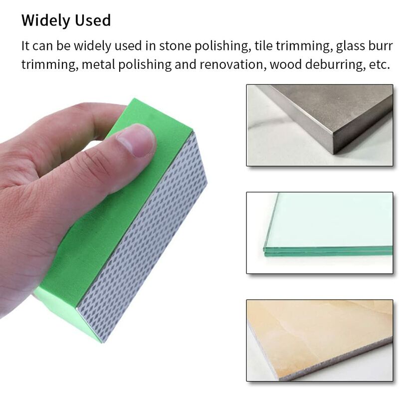 [Matériau de haute qualité] : nos patins de ponçage en diamant sont fabriqués en diamant, super résistants à l'usure. Nos patins de ponçage diamantés sont adaptés pour la pierre, le métal, le bois et la céramique et peuvent être utilisés pour traiter rapidement le granit, le marbre et les bords tranchants Description du produit : Matériau : diamant Couleur : rouge + bleu + vert + jaune Maille : maille 60/100/200/400., Dimensions : 9,5 x 6 x 3 cm., Poids : 28 g. Les éponges de ponçage en diamant sont conçues pour offrir une performance de polissage exceptionnelle sur divers matériaux. Ce set de 4 pièces comprend des blocs de ponçage avec des grains de 60, 100, 200 et 400, adaptés à des applications allant du grossier au fin 4. 4 types de grain : grain 60 pour l'ardoise générale et les carreaux de sol, grain 100 pour les carreaux ordinaires, grain 200 pour le verre, grain 400 pour un polissage fin [Facile à utiliser] : le tampon de ponçage diamant prend en charge le ponçage humide et sec. Lot de 4 tampons de polissage diamantés pour carrelage, verre Il suffit de vaporiser de l'eau et de frotter ensuite avec le tampon de polissage, même un débutant peut facilement obtenir une surface lisse [Large gamme d'applications] : convient pour la pierre, le métal, le bois et la céramique. Lot 4 Grains 60 100 200 400 SMLOPLOM Lot De 4 éponges De Ponçage Diamantées (60/100/200/400 Mailles Kit Ponçage Humide Sec Contenu de l'emballage : 4 patins de ponçage diamantés. Spécifications: Nos patins de ponçage diamantés sont en diamant, avec une répartition uniforme des grains, résistants à l'usure et durables. Quatre éponges abrasives avec différents grains (60/100/200/400) peuvent être utilisées en combinaison.