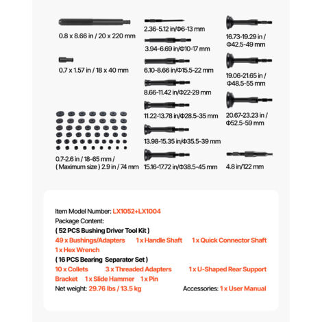 Jeu d'outils de démontage de roulements de 36 pièces - Omabeta - Acier Matériau de qualité supérieure Fabriqué en métal robuste avec une surface noircie résistante à la rouille, ce kit de tournevis pour joints de roulement offre des performances durables. Les vis maintiennent solidement les manchons et les bords polis évitent d'endommager les roulements et autres pièces. Il est idéal pour les mécaniciens automobiles ou les bricoleurs. Application polyvalente Ce kit de pose de joints facilite le démontage et le remplacement de divers roulements de roue. KS TOOLS 700.1550 Coffret d'outils pour le montage et le démontage des... Un tournevis haute dureté et un manchon de disque épais assurent une durabilité accrue. 1 x Manuel d'utilisation Contenu du coffret 1 x kit de presse à roulement, 1 clé hexagonale Caractéristiques principales Kit de roulements Le kit de presse pour roulements et joints comprend des manchons de disque de différentes tailles et un outil de montage complet. Notre jeu de tournevis pour roulements remplace les méthodes inefficaces et énergiques comme le marteau ou le burin Fonctionnement fiable Ce kit de tournevis pour roulements comprend une clé dédiée. Ce coffret permet de ranger tous les accessoires de manière ordonnée, facilitant ainsi leur transport et leur rangement, évitant ainsi toute perte. Poids net : 13,23 lb/6 kg Tailles polyvalentes Couvre une gamme complète de tailles de manchons de disque les plus couramment utilisés. Fonctionnement sans dommage : Vous pouvez assembler les manchons de disque à l'aide d'accessoires. Le manche est doté de motifs antidérapants pour une prise en main sûre et sans desserrage Spécification Numéro de modèle de l'article : XC2523A Il est équipé de 52 pièces, y compris manchons de disques de tailles courantes et de nombreux accessoires de montage pour un outillage complet Les vis de fixation et les bords des manchons de disque polis évitent d'endommager les roulements. Coffret Outils Démontage Roulements VEVOR Kit De Presse à Roulements 52 Pièces, Cofet | WhichOne Vevor 52 Pièces Mécanique Notre jeu de douilles est doté d'un revêtement noir oxydé pour une résistance à la rouille et à l'usure accrue La poignée en acier épais transmet efficacement la force de frappe et ses motifs antidérapants assurent une prise en main sûre. Coffret outils pour le montage et démontage de roulements PL KSTOOLS Manche en acier épais : Notre kit de tournevis pour joints de roulement est doté d'un manche long et épais qui transmet efficacement la force d'impact sans déformation.