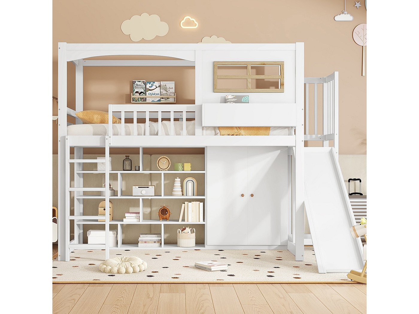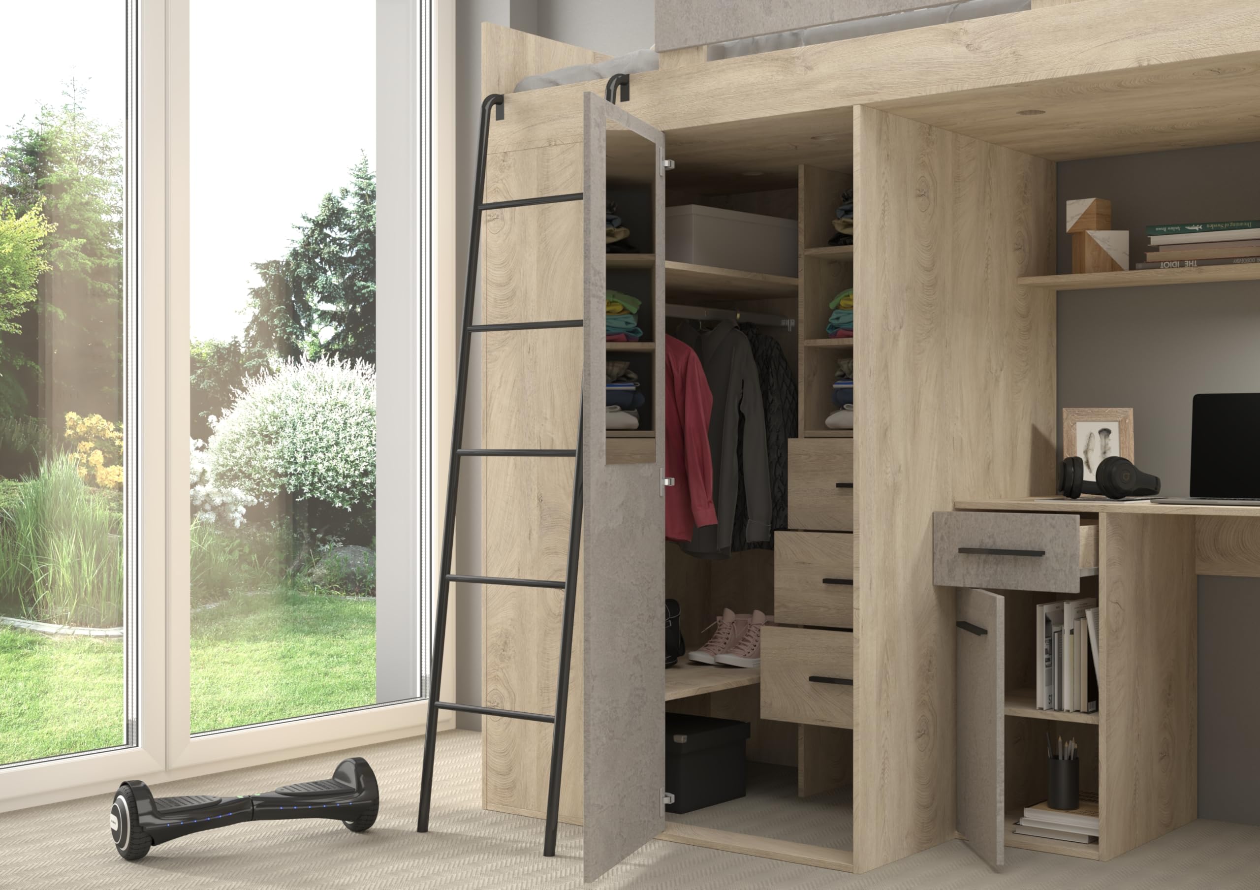 Une armoire avec trois tiroirs et des étagères Conçu pour optimiser l’espace et offrir une fonctionnalité maximale, ce lit mezzanine combine confort, rangement et espace de travail dans un seul meuble compact. Retours : Les frais de retour sont à la charge de l’acheteur ; le produit doit être retourné dans son emballage d’origine. Informations Complémentaires: Poids net: 224 kg. Livraison et Retours Livraison à la première porte uniquement : Le client doit organiser le transport à l’intérieur du bâtiment. Lits, chambre & literie, Lit mezzanine COMBI combiné bureau penderie Construction Sûre et Durable: Fabriqué en panneau de meuble laminé de 16 mm avec bords ABS, ce lit mezzanine offre robustesse, sécurité et une finition élégante – parfait pour les enfants ou les adolescents. Taille de Matelas Recommandée: 90 cm x 200 cm x 12 cm (matelas non inclus) Ce lit inclut un espace bureau sous le lit et une armoire pour un gain de place maximal et optimisé dans la chambre de votre enfant.Le bureau est équipé de 3 grands tiroirs de rangement, idéal pour organiser son espace de travail Lit Combiné Bureau Armoire Bibliothèque Lit Mezzanine Avec Bureau Et Rangement COMBINID - Blanc, Chambre Et Rangement VERANA Lit Mezzanine Bureau Armoire L’ensemble de meubles comprend : Un lit mezzanine avec échelle L’ensemble de meubles comprend : Design Gain de Place : Combine couchage, rangement et espace de travail en un seul meuble. Lit Mezzanine avec Bureau, Armoire et Bibliothèque - Lit Combiné Tout-en-Un pour Enfant - Ensemble Complet 236x120x190 cm - Couchage 90x200 cm - Échelle à Gauche - VERANA - (Chêne Sonoma - Blanc Finition de Haute Qualité : Construction durable et résistante. Une bibliothèque et des étagères supplémentaires Lit Mezzanine VERANA Ensemble de Meubles pour Chambre d’Enfant Transformez la chambre de votre enfant avec cet ensemble de meubles moderne et de haute qualité ! Nombre de colis: 7 (39 kg + 37 kg + 24 kg + 30 kg + 57 kg + 29 kg + 10 kg).
