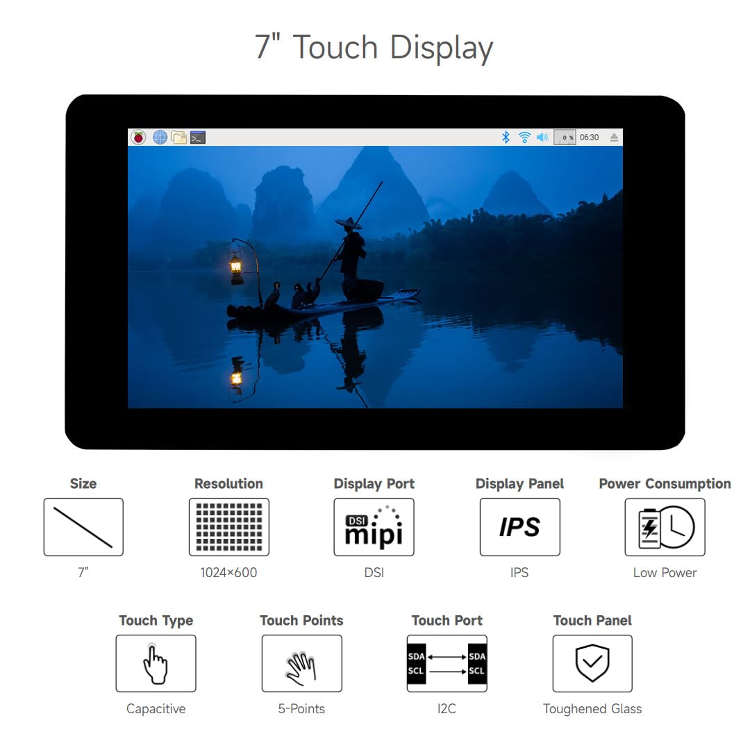 Drive the LCD through the DSI interface, with a refresh rate of up to 60Hz; Thinner and more space-saving: Integrates the driver circuit into an FPC cable, the total thickness of the LCD is only 9., 3mm Change the software config for landscape display. up to 10-point touch, depending on the operating system; up to 6H hardness toughened glass panel; Optical bonding, provides clear image; Adopts anti-fingerprint panel coating, easy to clean. Compatible with Raspberry Pi OS/ESP32-P4/RK3506/RK3576. Excellent Display Performance With 170° Wide Viewing Angle. Supports up to 5-point touch, depending on the operating system. Supports backlight adjustment via software. 7inch DSI Capacitive Touch Display, 1024 × 600 Pixels, IPS Panel. Voir plus de détails Top Brand Waveshare 7 DSI-TOUCH-A Waveshare 7inch DSI Capacitive Touch Display Compatible With Raspberry Pi 5/4B/3B+ And ESP32-P4/RK3506/RK3576, 720×1280, IPS Panel 10-Point Touch Screen, Anti-Fingerprint Process Mini Led Monitor 7inch Capacitive Touch Display for Raspberry Pi, with Protection Case, 800×480, DSI Interface | 7inch DSI LCD (with case A Rich WiKi Resources: We provide official Wiki resources, please visit our store and click the wiki page to get resources.