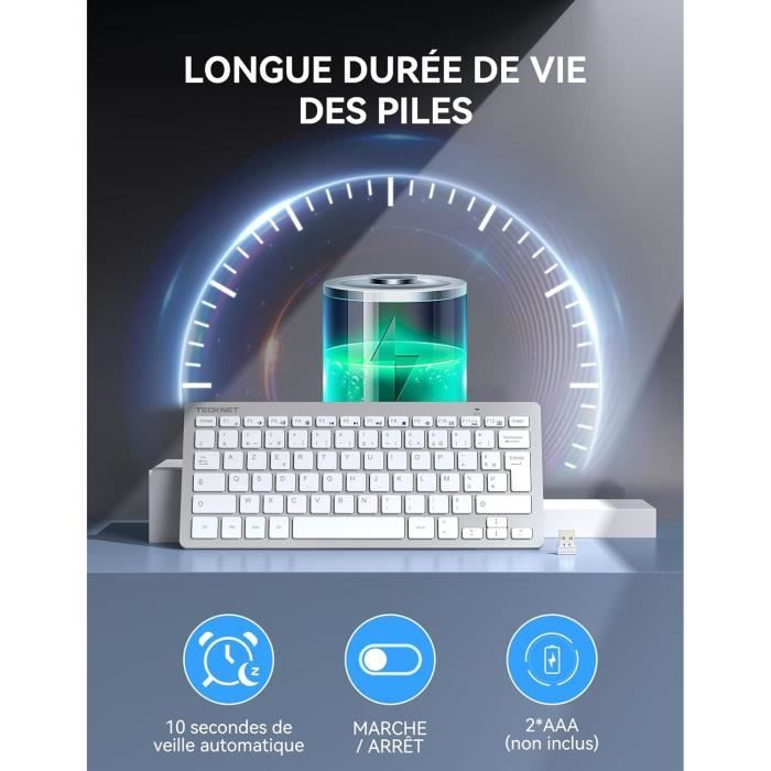 Spécification: Clavier Taille: 366mm (L) * 125mm (W) * 16mm (H) Batterie: batterie au lithium 280mAh Temps de travail continu : 35 heures une fois complètement chargé Autonomie en veille : 35 jours une fois complètement chargée des touches : 3 millions de frappes Indicateur de charge : indicateur de faible puissance (le voyant rouge clignote) et indicateur de charge (le voyant rouge est allumé signifie qu'il est en charge, le voyant rouge est éteint signifie qu'il est complètement chargé) Indicateur de verrouillage Fn : le voyant bleu s'allume lorsque les touches fn sont verrouillées Indicateur de verrouillage numérique - Le voyant vert s'allume lorsque le verrouillage numérique est activé. Le clavier sans fil rechargeable est un accessoire indispensable pour les utilisateurs d'ordinateurs et de portables. Fini les problèmes de câbles encombrants et les piles qui se déchargent rapidement Indicateur de verrouillage des majuscules - Le voyant vert s'allume lorsque le verrouillage des majuscules est activé. La souris sans fil 2., 4Ghz a 3 niveaux de DPI : 800 1200 1600., Vous pouvez définir le DPI de la souris et mieux contrôler l'ordinateur. Nous sommes toujours là pour tout problème d'utilisation. Clavier Mac Clavier Souris Sans Fil Rechargeable, 2.4G USB Clavier Azerty Francais Ultra Mince Full Size Avec Pave Numerique Souris Clic Silencieux Pour Pc Ordinateurs Notebook Windows 10 8 7 Blanc Clavier Bluetooth Connexion pratique et stable : la technologie 2., 4G garantit que la connexion du clavier et de la souris sans fil est plus stable. Conception ultra-mince et pleine taille : taille du clavier mince : 425 * 125 * 16 mm. Contenu de l'emballage : 1 * clavier sans fil, 1 * souris sans fil, 1 * récepteur USB (placé dans le compartiment à piles à l'arrière de la souris), 1 * manuel d'utilisation. Aucun pilote n'est requis, aucune installation n'est requise et vous pouvez utiliser un récepteur USB pour connecter votre clavier et votre souris à votre PC sur des distances allant jusqu'à 10M. TECKNET Clavier sans Fil Mini 2.4G, Ultra-Mince AZERTY Clavier Batterie Longue Durée avec 12 (Le récepteur USB est placé à l'arrière de la souris). Be practical: le clavier comme la souris sont sans fil, avec un Smart dongle unique. Ils sont rechargeables via un cble micro USB fourni. Les batteries vous garantissent une autonomie maximale allant jusqu’à 3 mois d’utilisation en une charge