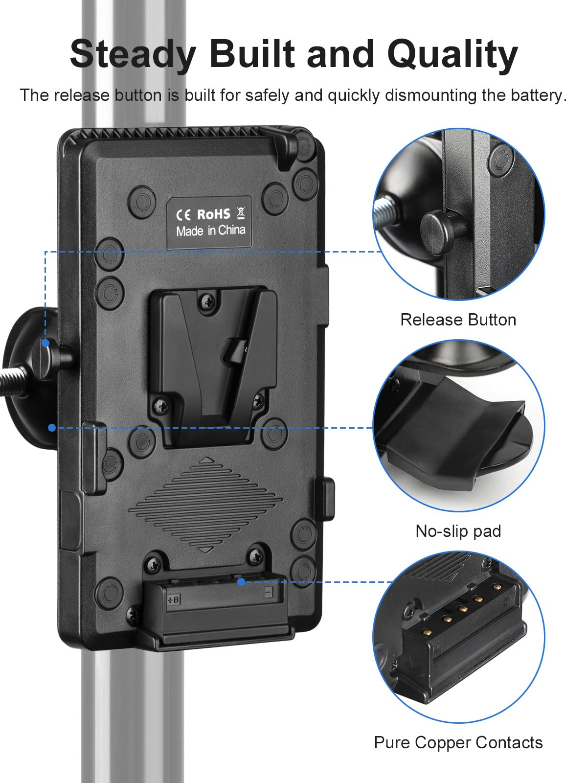 De plus, sa résistance aux acides, aux alcalis et aux sels lui permet de résister aux environnements extérieurs, garantissant ainsi longévité et fiabilité. Plaque d'adaptation de batterie V-Lock avec connecteur XLR 4 broches 1., La plaque de suspension de batterie à montage en V multi-espace peut fixer la batterie à montage en V à l'appareil photo pour prolonger le temps de travail de la photographie., 2., L'adaptateur de plaque de batterie est étendu avec un port de sortie D‑Tap et un port de sortie DIY, qui peuvent être associés à d'autres équipements pour fournir de l'énergie en fonction des besoins., 3., La plaque de batterie améliorée ajoute plusieurs positions de fixation de vis pour faire face à la cage de caméra interchangeable, qui est compatible avec presque toutes les caméras du marché., 4., Adoptant une coque ABS, il a une dureté élevée, une bonne résistance à la chaleur, une forte résistance aux acides, aux alcalis et au sel., 5., Les broches métalliques cuivrées ont une lisse, ne rouillent pas facilement, ont une dureté élevée et une excellente résistance à la chaleur. La conception robuste minimise les risques d'usure, faisant de cette plaque de batterie un investissement pour votre équipement photo. Connexions fiables : avec des broches métalliques plaquées cuivre, la plaque de batterie V-Mount offre une de lisse et résistante à la rouille. Cette flexibilité vous permet de connecter d'autres équipements, tels que des lumières ou des moniteurs, pour fournir de l'énergie là où vous en avez besoin. Cette fonctionnalité permet une intégration transparente dans diverses configurations, répondant à divers besoins de tournage. Plaque de montage SmallRig 4505 pour batterie V-Mount 193 g / 6,8 oz Interface : support D-Tap, support en V, borne positive et négative DIY Tension de sortie : Support D-Tap 14,8 V (identique à la tension de sortie de la batterie) Poste DIY et borne négative 14,8 V (identique à la tension de sortie de la batterie) Batterie applicable : batterie à monture en V Modèles applicables : caméra vidéo Mode d'emploi: 1., Fixez la plaque de batterie à la caméra ou à la cage de la caméra avec une vis de fixation., 2., La baïonnette de la batterie à montage en V est alignée avec la borne de la plaque de la batterie et bloquée., 3., Lors du retrait, maintenez enfoncé le bouton de verrouillage du port de la batterie et retirez la batterie. Hersmay V-Mount Plaque de batterie V-Lock D-Tap pour appareil photo reflex numérique, appareil photo, radio Plaque Batterie V Mount Plaque D'adaptation De Batterie V-Lock Avec Connecteur XLR 4 Broches Prolongation Autonomie Tournage Sorties de puissance polyvalentes : doté d'un port de sortie D-Tap et d'un port de sortie DIY, l'adaptateur de plaque de batterie offre diverses options d'alimentation. Liste des colis: 1 x plaque de batterie V-Mount 4 x vis de fixation 8 x bloc 1 x manuel Cet accessoire essentiel garantit une alimentation électrique stable, vous permettant de capturer chaque moment important sans avoir à changer les piles. 【 et résistant à la chaleur】 Construite avec une coque ABS de haute qualité, la plaque de batterie offre une dureté et une résistance à la chaleur impressionnantes. Cela le rend adapté aux conditions de prise de vue intenses et garantit qu'il résiste aux rigueurs d'un usage professionnel.