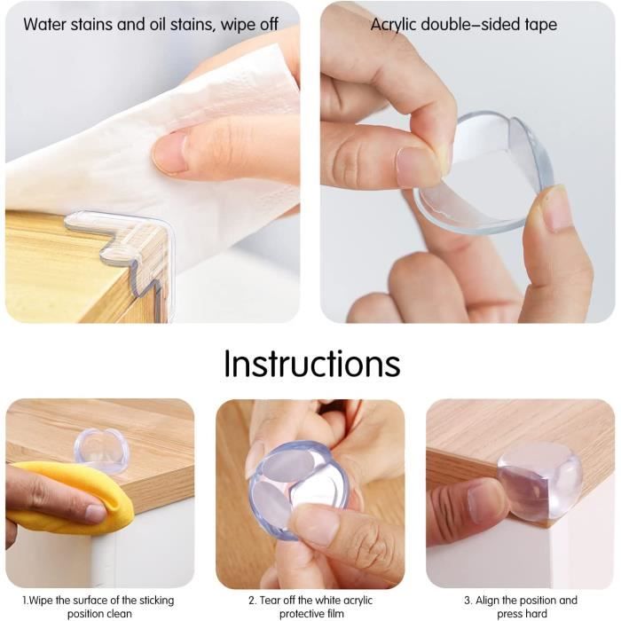 Ils s'intègrent parfaitement à vos meubles et conservent l'aspect et la sensation d'origine de vos meubles. Coin de table protection: Notre protection d'angle de table pour enfants a déjà une couche adhésive sur la surface, il vous suffit de retirer le film de surface et de coller la protection de bord de table directement sur votre meuble, et de fixer le support autocollant dans le l’endroit souhaité en appuyant fermement. Nous vous proposons un lot de 4 protèges coins de table transparents, pour la protection d'angles de plateau de table, tablette ou meuble. Les protèges coins de table sont discrets et faciles à mettre en place. Conforme aux normes EN 71-3 2013 A2 2017 Doux et Sûr: Nos coin table protection bébé sont fabriqués en silicone PVC de haute qualité, sans produits chimiques, sans phtalates et sans métaux lourds. Le matériau est épais, doux et flexible, ce qui permet d'assurer une bonne protection Le protège-coin bébé est doux, durable, facile à nettoyer et offre une solution à long terme pour protéger votre famille. Protection Coin De Table Bebe Coin De Table Protection Protecteurs D 039 Angle Transparents Souple Protections d'angle pour meuble: Fabriqués en pvc respectueux de l'environnement, non toxique et sans odeur. Le matériau pvc amélioré de la protection d'angle est plus flexible et plus léger dans les coins pour réduire le risque de blessure. Protections Coins Table Bébé Lot De 8 Protection Coin De Table, Mousse Souple Protection Angle Protections Angle Bébé Avant l'installation, veuillez nettoyer la surface pour vous assurer qu'il n'y a pas de poussière, d'eau ou d'huile. Comment installer des protections d'angle ? 1., Essuyez la poussière de la surface du meuble avec un chiffon sec., 2., Retirez le papier au dos de la protection d'angle de table et collez-le directement sur le meuble. Appuyez fermement avec vos mains pendant 20 secondes.