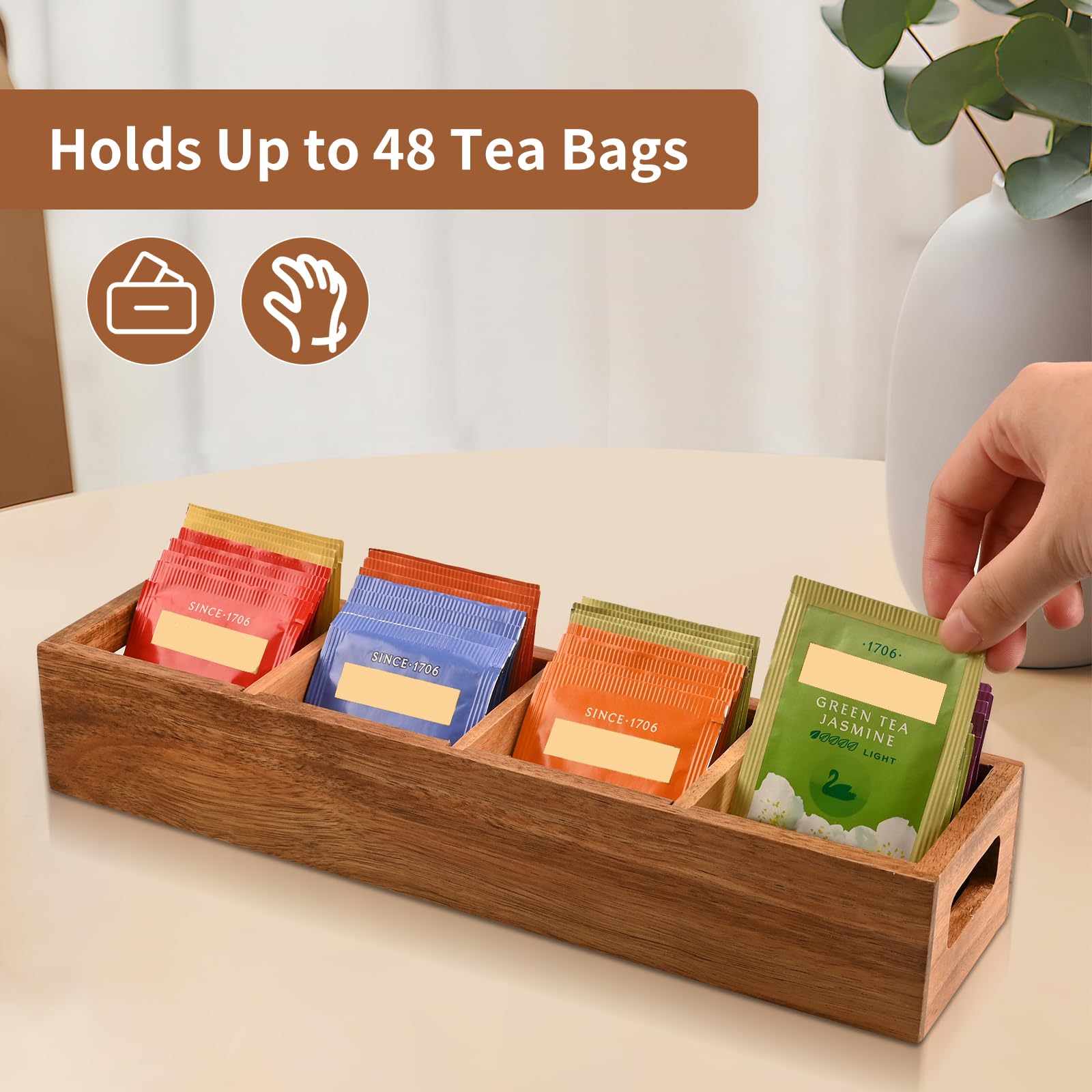 Matériau : bois de pin ; taille : 24 x 7,6 x 6 cm (L x l x H) ; contenu de l'emballage : 2 organiseurs de sachets de thé ; et les 3 compartiments offrent suffisamment d'espace pour stocker, organiser et séparer les sachets de thé, le sucre, le sel et plus encore Réglable : les séparateurs du porte-sachets de sucre sont amovibles, ce qui est pratique pour ajuster l'espace interne pour accueillir des sachets de thé de différentes tailles selon les besoins. Boîte Rangement Thé Compartiments Boîte à Thé Avec 6 Compartiments, Boîte De Rangement Pour Sachets De Organiseur Thé Description : Matériau du bois : notre boîte de rangement pour sachets de thé est fabriquée en bois de pin avec une surface peinte, qui est légère, robuste et facile à nettoyer. Matériau : bois de pin ; taille : 24 x 7,9 x 6 cm (L x l x H) ; contenu de l'emballage : 1 organiseur de sachets de thé ; et les 3 compartiments offrent suffisamment d'espace pour stocker, organiser et séparer les sachets de thé, le sucre, le sel et plus encore. Matériau du bois : notre boîte de rangement pour sachets de thé est fabriquée en bois de pin avec une surface peinte, qui est légère, robuste et facile à nettoyer. Organiseur Rangement Maquillage 4 Compartiments Noir Et Bambou - Boite... sourcing map Lot de 2 organiseurs de sachets de thé, 3 Design de la poignée : deux poignées intégrées sont pratiques pour déplacer et emporter, adaptées pour les armoires, les comptoirs et les étagères de cuisine. Caractéristiques : Couleur : noir. Il n'y a pas de débris sur la surface de la boîte, ce qui peut être utilisé pendant une longue période.