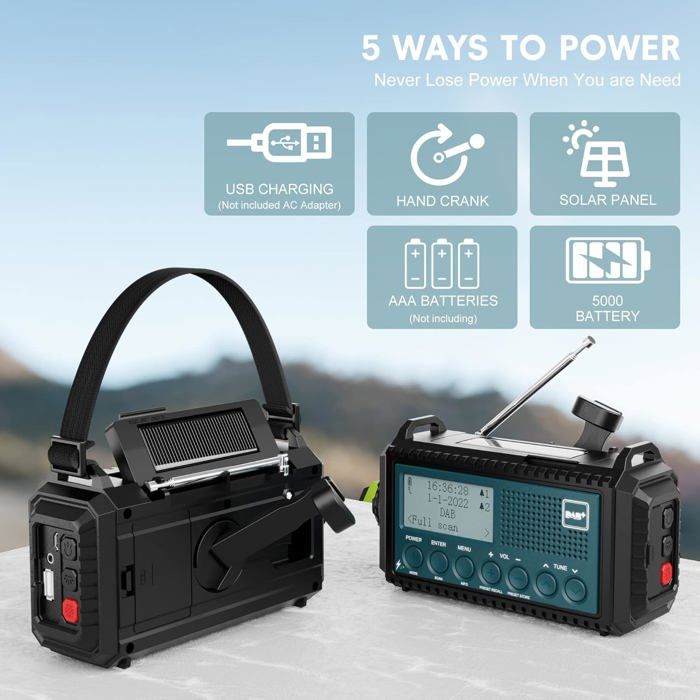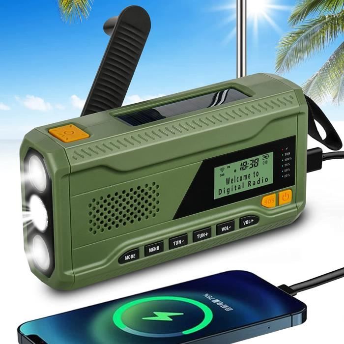 ⑦ Bluetooth, ⑧entrée AUX et ⑨interface pour carte TF offrent des possibilités de divertissement modernes. Radio solaire FM/AM/SW à manivelle, musique TF, Bl... – Grandado Radio numérique DAB+/FM avec 20 000 mAh & solaire/manivelle – Radio d'urgence IP53, alarme SOS, 7 LED, FM/Bluetooth 5., 3, 12 menus vocaux pour camping en plein air 【Le cadeau idéal】Cette radio multibande est le compagnon idéal pour une utilisation à la maison, en camping, lors d'aventures en plein air et pour la préparation aux situations d'urgence. Que ce soit en camping, lors d'un pique-nique ou lors d'une soirée tranquille à la maison. La combinaison parfaite entre équipement de survie et confort high-tech., 【Bluetooth 5., 3 et fonction horloge】 Cette radio portable polyvalente allie une qualité audio exceptionnelle à des fonctions pratiques au quotidien : en tant qu'enceinte Bluetooth puissante, elle offre un son clair et équilibré qui élève votre expérience musicale en extérieur à un niveau supérieur. Réveillez-vous en toute sérénité avec votre station préférée et profitez d'un sommeil réparateur grâce à la minuterie d'arrêt automatique pratique qui régule intelligemment la consommation de la batterie. Radio Solaire À Manivelle Radio Portable 2000 Mah Radio Météo D'Urgence... C'est votre partenaire idéal pour les aventures en plein air et les situations d'urgence : la fonction d'alarme SOS intégrée, la boussole précise et la lampe de poche LED puissante avec fonction lampe de lecture en font un compagnon indispensable pour les randonnées, les coupures de courant ou les urgences. Radio Camping Charge USB Radio à Manivelle DAB+/FM - Portable Avec Survie Equipement Radio Manivelle Survie Radio D'Urgence à Manivelle - Solaire, Bluetooth 5.0, Lampe Torche Et Lecteur MP3 Radio Solaire FM DAB Radio Dynamo Survie ⑩Écran TFT⑪IP53 étanche. Le boîtier compact allie durabilité et portabilité, pour que vous soyez toujours bien informé, en sécurité et diverti. 【Radio d'urgence 20000 mAh avec 3 options de recharge】Grâce à sa batterie géante de 20 000 mAh et à ses trois options de recharge flexibles : recharge rapide via USB-C, énergie solaire via le panneau solaire intégré ou recharge manuelle via une manivelle. Qu'il s'agisse d'un smartphone, d'une tablette ou d'autres appareils USB, cette radio recharge vos appareils de manière fiable, même dans des zones reculées ou en cas de panne de courant. 【Radio d'urgence multifonctionnelle 11 en 1】 La radio d'urgence Wholede combine des fonctions vitales dans un design compact : ① Radio d'urgence ② Batterie mobile 20000 mAh ③ Alarme SOS ④ Lampe torche puissante ⑤ Lampe de lecture LED ⑥ Boussole intégrée.