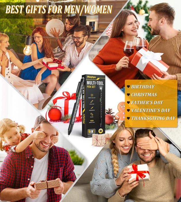 Le stylo multifonction Maqhpu 9-en-1 est un gadget idéal, innovant et pratique qui peut vous aider à gagner beaucoup de temps, faciliter votre travail et est facile à transporter 【Prêt à l’emploi, où que vous alliez】Son design compact et léger se glisse facilement dans une poche, un sac à main, un dossier ou un carnet. Cadeau Noel Homme Stylo Multifonction 6 En 1 - Cadeau Homme Pour Anniversaire - Gadgets Uniques Pour Homme, Mari, Grand-père, Ingénieur, Bricoleur - Stylo à Bille, Stylet, Tournevis, Niveau à Bulle, Règle stylo multifonction 12 en 1 【Satisfaction garantie】Votre plaisir est notre priorité. Si vous avez la moindre question ou suggestion, notre équipe de service après-vente est à votre disposition pour trouver une solution adaptée. Utile cadeau fête des pères:stylo multi-outils 6 en 1 comprenant 4 recharges de stylo à bille,niveau à bulle,règle,une fente et un tournevis cruciforme,stylet à écran tactile,clip de poche.Vous pouvez utiliser des bricolage outillage dans de nombreux endroits de votre vie.Bricolage stylo fete des pères cadeau pour papa,uniques cadeau pour homme original Idee cadeau homme original... Idee Regalo Uomo Natale Originale - Penna Multifunzione Regali Uomo Papà Donna N 【Cadeau qui ravira les amateurs de praticité】Que ce soit pour votre mari, père, grand-père ou petit ami, ce stylo est bien plus qu’un accessoire : c’est un symbole de créativité et d’efficacité. Aucun effort pour le transporter : il est toujours là, prêt à vous dépanner, que ce soit en déplacement, au bureau ou lors d’un week-end en plein air 【Stylo à outils 12 en 1】Ce stylo-outil compact combine une variété de fonctions de base : recharge de stylo à bille lisse, niveau précis, mètre, tournevis, décapsuleur pratique, support antidérapant pour téléphone portable, stylet ultra-sensible et lumière LED brillante, et bien d'autres choses encore.